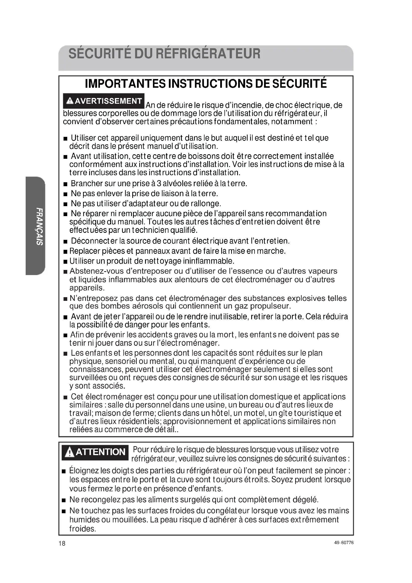 ATTENTION Pour réduire le risque de blessures lorsque vous utilisez votre réfrigérateur, veuillez suivre les consignes de sécurité suivantes : Ŷ Éloignez les doigts des parties du réfrigérateur où l’on peut facilement se pincer : les espaces entre le porte et la cuve sont toujours étroits. Soyez prudent lorsque vous fermez le porte en présence d’enfants. Ŷ Ne recongelez pas les aliments surgelés qui ont complètement dégelé. Ŷ Ne touchez pas les surfaces froides du congélateur lorsque vous avez les mains humides ou mouillées. La peau risque d’adhérer à ces surfaces extrêmement froides.19 49-60776 FRANÇAIS MISE AU REBUT DE VOTRE VIEIL APPAREIL AVERTISSEMENT RISQUE DE SUFFOQUER OU D’Y ÊTRE EMPRISONNÉ Le non-respect de ces instructions d’élimination peut entraîner la mort ou des blessures graves. IMPORTANT: Les enfants pris au piège ou morts d’asphyxie sont toujours d’actualité. Les réfrigérateurs et congélateurs abandonnés sont toujours aussi dangereux, même si on n’attend que «quelques jours» pour s’en débarrasser. Si vous ne gardez pas votre ancien réfrigérateur ou congélateur, veuillez suivre les directives ci-dessous afin de prévenir les accidents. Avant de vous débarrasser de votre ancien appareil ŶÔter les porte. ŶLaisser les tablettes en place de sorte que les enfants ne puissent pas y pénétrer facilement.