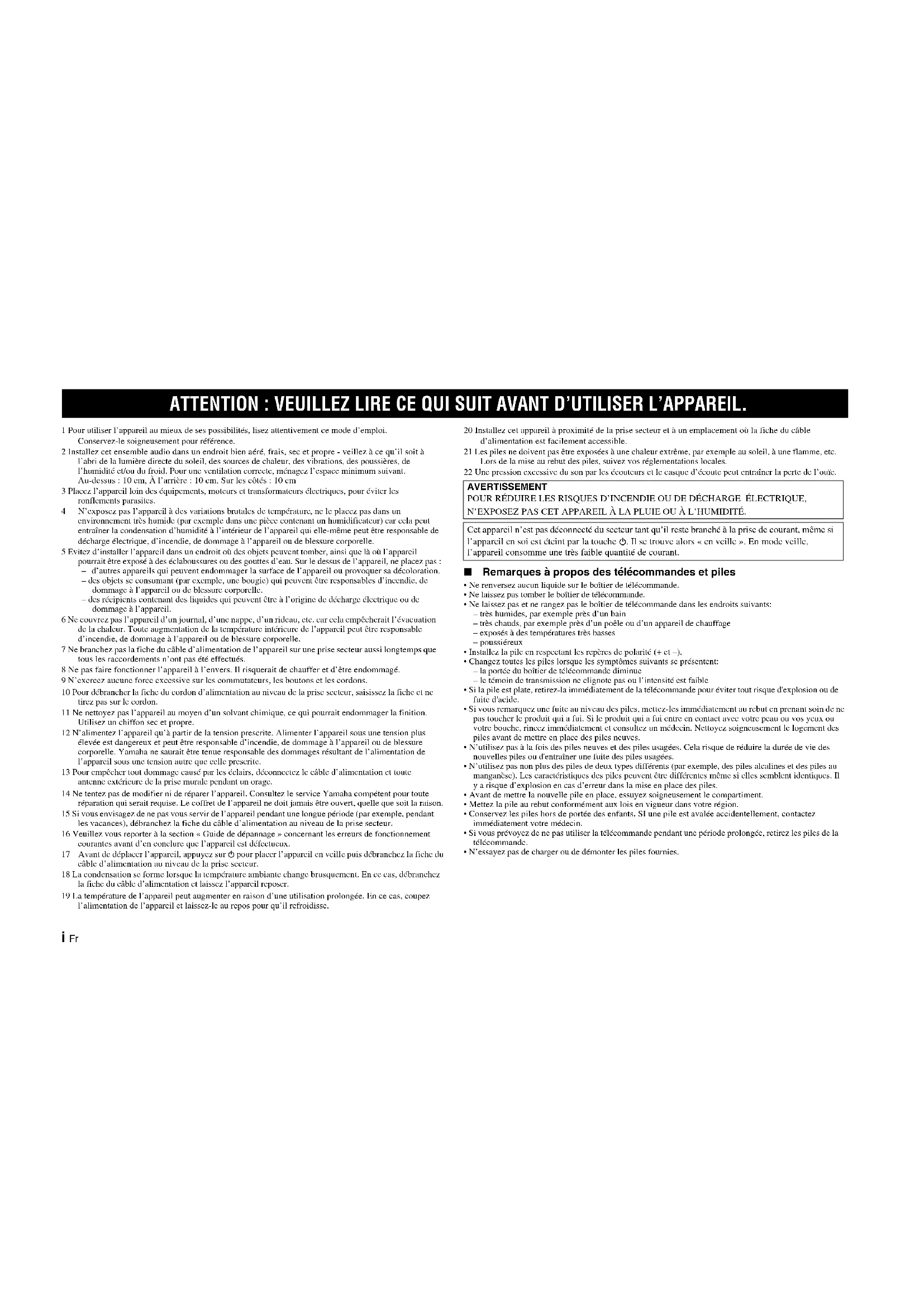 - Power supply ..........................................AC 220 to 240 V, 50/60 Hz• Power consumption ...................................................................30 W• Standby power consumption .................................................... 0.5 W• Dimensions (W × H × D) ..............................314 × 70 × 342 mm (12-3/8" × 2-3/4" × 13-1/2")• Weight....................................................................... 3.3 kg (7.3 lbs.)Specifications are subject to change without notice. SPECIFICATIONSATTENTION : VEUILLEZ LIRE CE QUI SUIT AVANT D’UTILISER L’APPAREIL. i Fr 1 Pour utiliser l’appareil au mieux de ses possibilités, lisez attentivement ce mode d’emploi. Conservez-le soigneusement pour référence. 2 Installez cet ensemble audio dans un endroit bien aéré, frais, sec et propre - veillez à ce qu’il soit à l’abri de la lumière directe du soleil, des sources de chaleur, des vibrations, des poussières, de l’humidité et/ou du froid. Pour une ventilation correcte, ménagez l’espace minimum suivant. Au-dessus : 10 cm, À l’arrière : 10 cm, Sur les côtés : 10 cm 3 Placez l’appareil loin des équipements, moteurs et transformateurs électriques, pour éviter les ronflements parasites. 4 N’exposez pas l’appareil à des variations brutales de température, ne le placez pas dans un environnement très humide (par exemple dans une pièce contenant un humidificateur) car cela peut entraîner la condensation d’humidité à l’intérieur de l’appareil qui elle-même peut être responsable de décharge électrique, d’incendie, de dommage à l’appareil ou de blessure corporelle. 5 Evitez d’installer l’appareil dans un endroit où des objets peuvent tomber, ainsi que là où l’appareil pourrait être exposé à des éclaboussures ou des gouttes d’eau. Sur le dessus de l’appareil, ne placez pas : – d’autres appareils qui peuvent endommager la surface de l’appareil ou provoquer sa décoloration. – des objets se consumant (par exemple, une bougie) qui peuvent être responsables d’incendie, de dommage à l’appareil ou de blessure corporelle. – des récipients contenant des liquides qui peuvent être à l’origine de décharge électrique ou de dommage à l’appareil. 6 Ne couvrez pas l’appareil d’un journal, d’une nappe, d’un rideau, etc. car cela empêcherait l’évacuation de la chaleur. Toute augmentation de la température intérieure de l’appareil peut être responsable d’incendie, de dommage à l’appareil ou de blessure corporelle. 7 Ne branchez pas la fiche du câble d’alimentation de l’appareil sur une prise secteur aussi longtemps que tous les raccordements n’ont pas été effectués. 8 Ne pas faire fonctionner l’appareil à l’envers. Il risquerait de chauffer et d’être endommagé. 9 N’exercez aucune force excessive sur les commutateurs, les boutons et les cordons. 10 Pour débrancher la fiche du cordon d’alimentation au niveau de la prise secteur, saisissez la fiche et ne tirez pas sur le cordon. 11 Ne nettoyez pas l’appareil au moyen d’un solvant chimique, ce qui pourrait endommager la finition. Utilisez un chiffon sec et propre. 12 N’alimentez l’appareil qu’à partir de la tension prescrite. Alimenter l’appareil sous une tension plus élevée est dangereux et peut être responsable d’incendie, de dommage à l’appareil ou de blessure corporelle. Yamaha ne saurait être tenue responsable des dommages résultant de l’alimentation de l’appareil sous une tension autre que celle prescrite. 13 Pour empêcher tout dommage causé par les éclairs, déconnectez le câble d’alimentation et toute antenne extérieure de la prise murale pendant un orage. 14 Ne tentez pas de modifier ni de réparer l’appareil. Consultez le service Yamaha compétent pour toute réparation qui serait requise. Le coffret de l’appareil ne doit jamais être ouvert, quelle que soit la raison. 15 Si vous envisagez de ne pas vous servir de l’appareil pendant une longue période (par exemple, pendant les vacances), débranchez la fiche du câble d’alimentation au niveau de la prise secteur. 16 Veuillez vous reporter à la section « Guide de dépannage » concernant les erreurs de fonctionnement courantes avant d’en conclure que l’appareil est défectueux. 17 Avant de déplacer l’appareil, appuyez sur A pour placer l’appareil en veille puis débranchez la fiche du câble d’alimentation au niveau de la prise secteur. 18 La condensation se forme lorsque la température ambiante change brusquement. En ce cas, débranchez la fiche du câble d’alimentation et laissez l’appareil reposer. 19 La température de l’appareil peut augmenter en raison d’une utilisation prolongée. En ce cas, coupez l’alimentation de l’appareil et laissez-le au repos pour qu’il refroidisse. 20 Installez cet appareil à proximité de la prise secteur et à un emplacement où la fiche du câble d’alimentation est facilement accessible. 21 Les piles ne doivent pas être exposées à une chaleur extrême, par exemple au soleil, à une flamme, etc. Lors de la mise au rebut des piles, suivez vos réglementations locales. 22 Une pression excessive du son par les écouteurs et le casque d’écoute peut entraîner la perte de l’ouïe. n Remarques à propos des télécommandes et piles