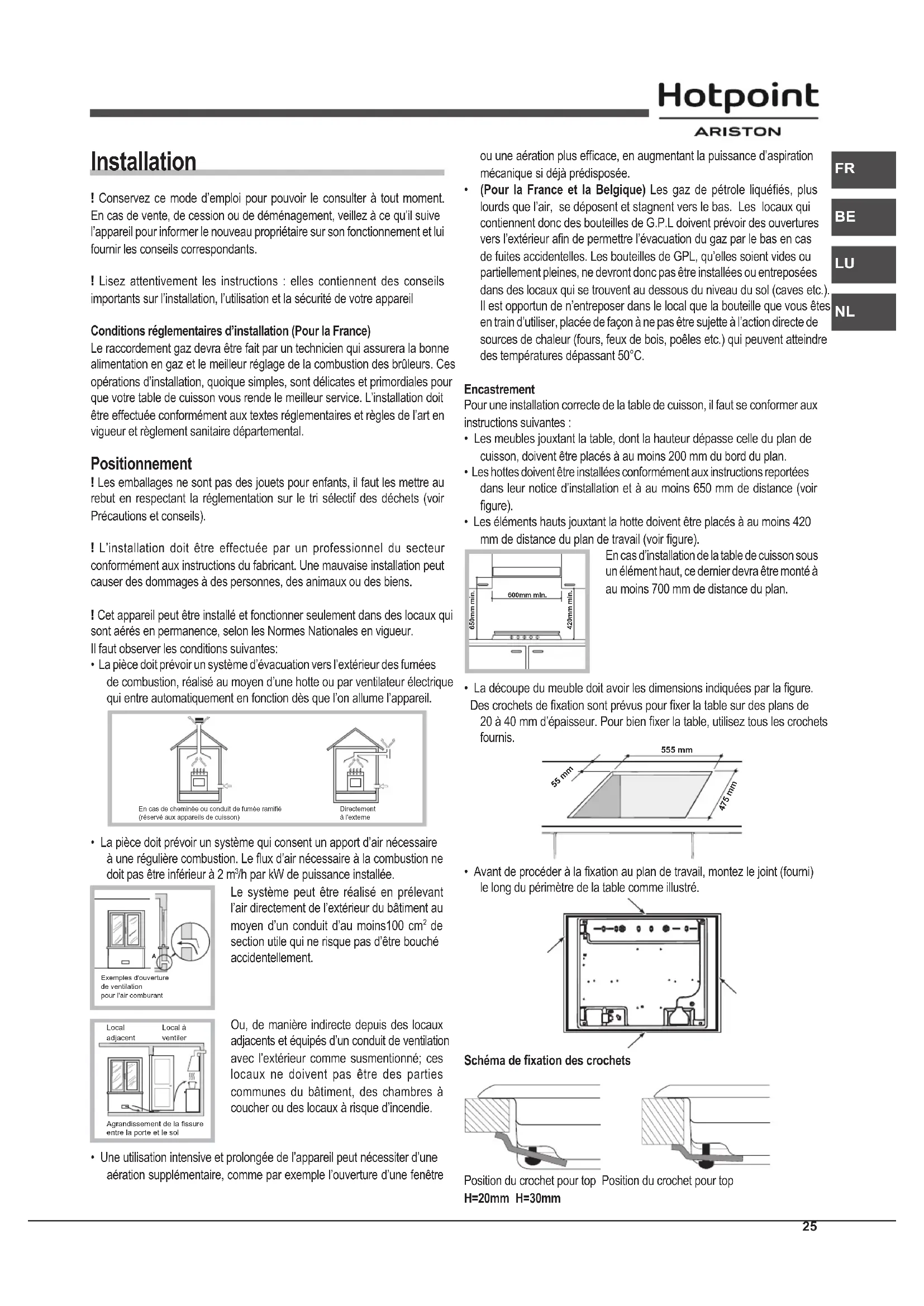 Installation ! Conservez ce mode d’emploi pour pouvoir le consulter à tout moment. En cas de vente, de cession ou de déménagement, veillez à ce qu’il suive l’appareil pour informer le nouveau propriétaire sur son fonctionnement et lui fournir les conseils correspondants. ! Lisez attentivement les instructions : elles contiennent des conseils importants sur l’installation, l’utilisation et la sécurité de votre appareil Conditions réglementaires d’installation (Pour la France) Le raccordement gaz devra être fait par un technicien qui assurera la bonne alimentation en gaz et le meilleur réglage de la combustion des brûleurs. Ces opérations d’installation, quoique simples, sont délicates et primordiales pour que votre table de cuisson vous rende le meilleur service. L’installation doit être effectuée conformément aux textes réglementaires et règles de l’art en vigueur et règlement sanitaire départemental. Positionnement ! Les emballages ne sont pas des jouets pour enfants, il faut les mettre au rebut en respectant la réglementation sur le tri sélectif des déchets (voir Précautions et conseils). ! L’installation doit être effectuée par un professionnel du secteur conformément aux instructions du fabricant. Une mauvaise installation peut causer des dommages à des personnes, des animaux ou des biens. ! Cet appareil peut être installé et fonctionner seulement dans des locaux qui sont aérés en permanence, selon les Normes Nationales en vigueur. Il faut observer les conditions suivantes: