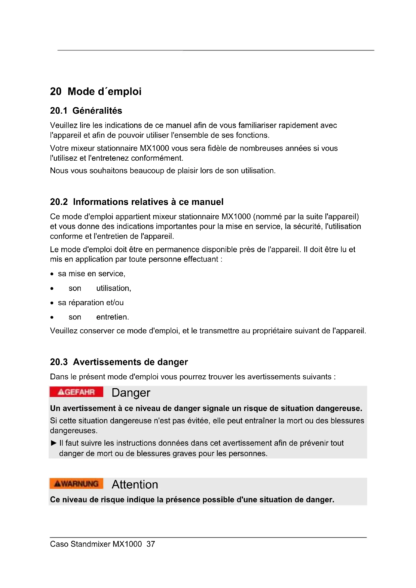 Attention Ce niveau de risque indique la présence possible d'une situation de danger.Caso Standmixer MX1000 38 Si cette situation dangereuse n'est pas évitée, elle peut entraîner des blessures graves. ► Il faut suivre les instructions données dans cet avertissement afin de prévenir tout danger de blessures graves. Prudence Ce niveau de risque indique la présence possible d'une situation de danger. Si cette situation dangereuse n'est pas évitée, elle peut entraîner des blessures légères ou superficielles. ► Il faut suivre les instructions données dans cet avertissement afin de prévenir les blessures de personnes. Remarque Cette indication est accompagnée d'informations complémentaires pour faciliter l'utilisation de l'appareil.