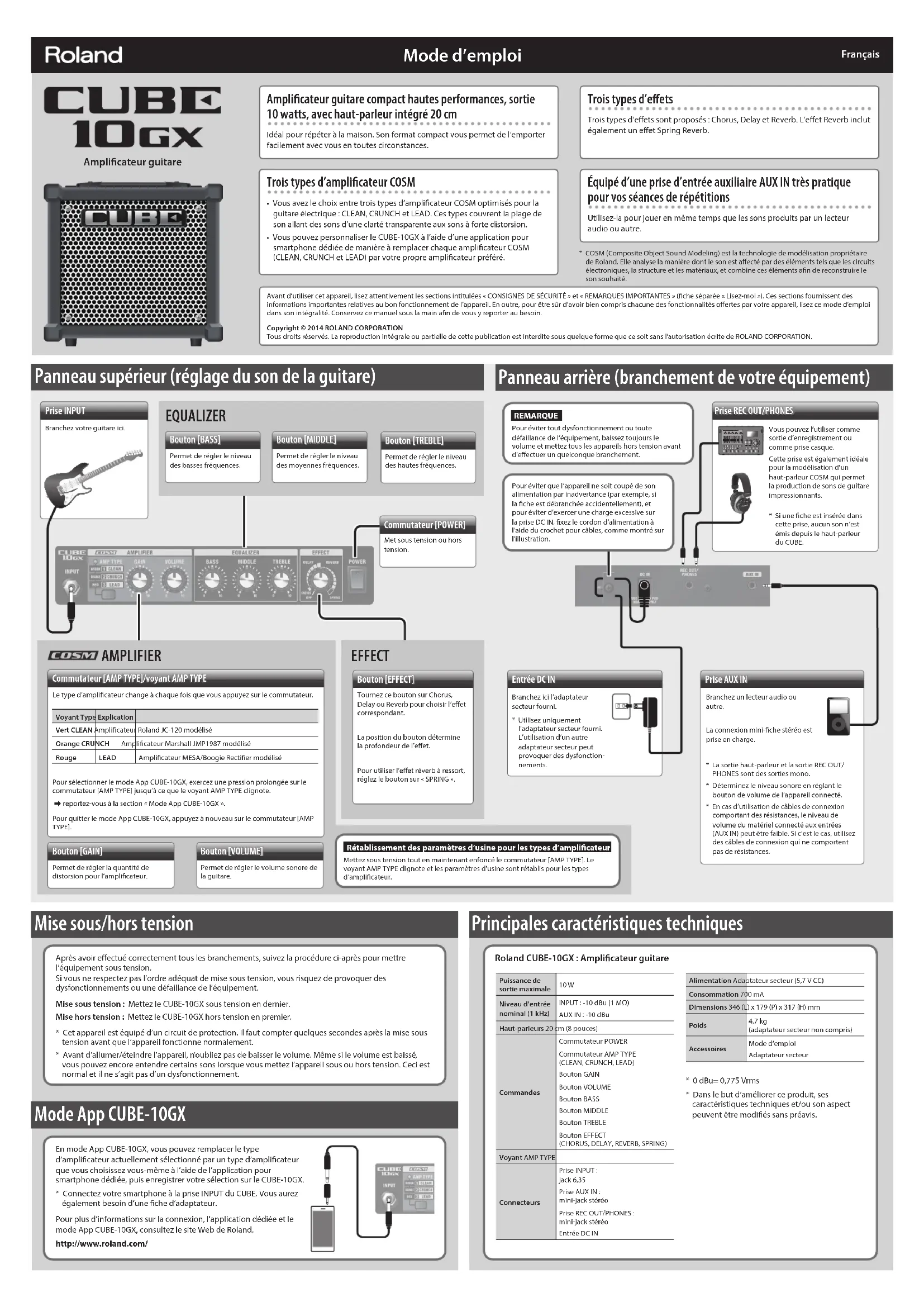Mode d’emploi Panneau supérieur (réglage du son de la guitare) Panneau arrière (branchement de votre équipement) Avant d’utiliser cet appareil, lisez attentivement les sections intitulées «CONSIGNES DE SÉCURITÉ» et «REMARQUES IMPORTANTES» (che séparée « Lisez-moi»). Ces sections fournissent des informations importantes relatives au bon fonctionnement de l’appareil. En outre, pour être sûr d’avoir bien compris chacune des fonctionnalités oertes par votre appareil, lisez ce mode d’emploi dans son intégralité. Conservez ce manuel sous la main an de vous y reporter au besoin.Copyright © 2014 ROLAND CORPORATION Tous droits réservés. La reproduction intégrale ou partielle de cette publication est interdite sous quelque forme que ce soit sans l’autorisation écrite de ROLAND CORPORATION. Principales caractéristiques techniques
