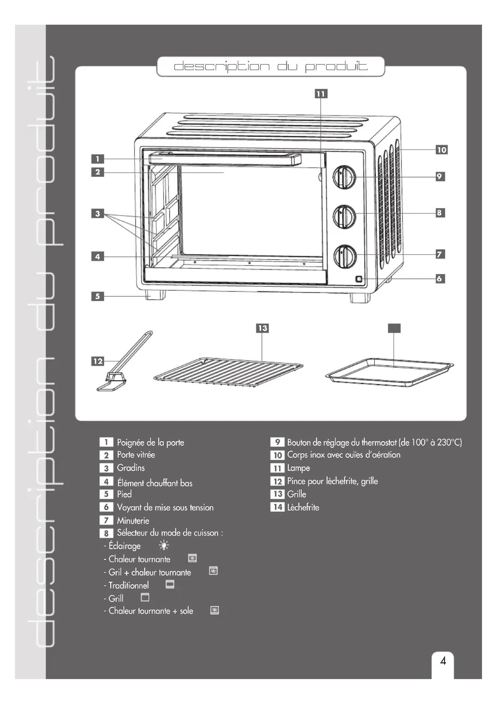 Une légère fumée ou odeur de brûlée peut se dégager de l’appareil, ceci est tout à fait normal et disparaît rapidement à l’usage. A noter La cavité du four est équipée de gradins (3)vous permettant de régler la hauteur des accessoires en fonction des plats cuisinés. Par exemple, pour un gratin, vous utiliserez le 1