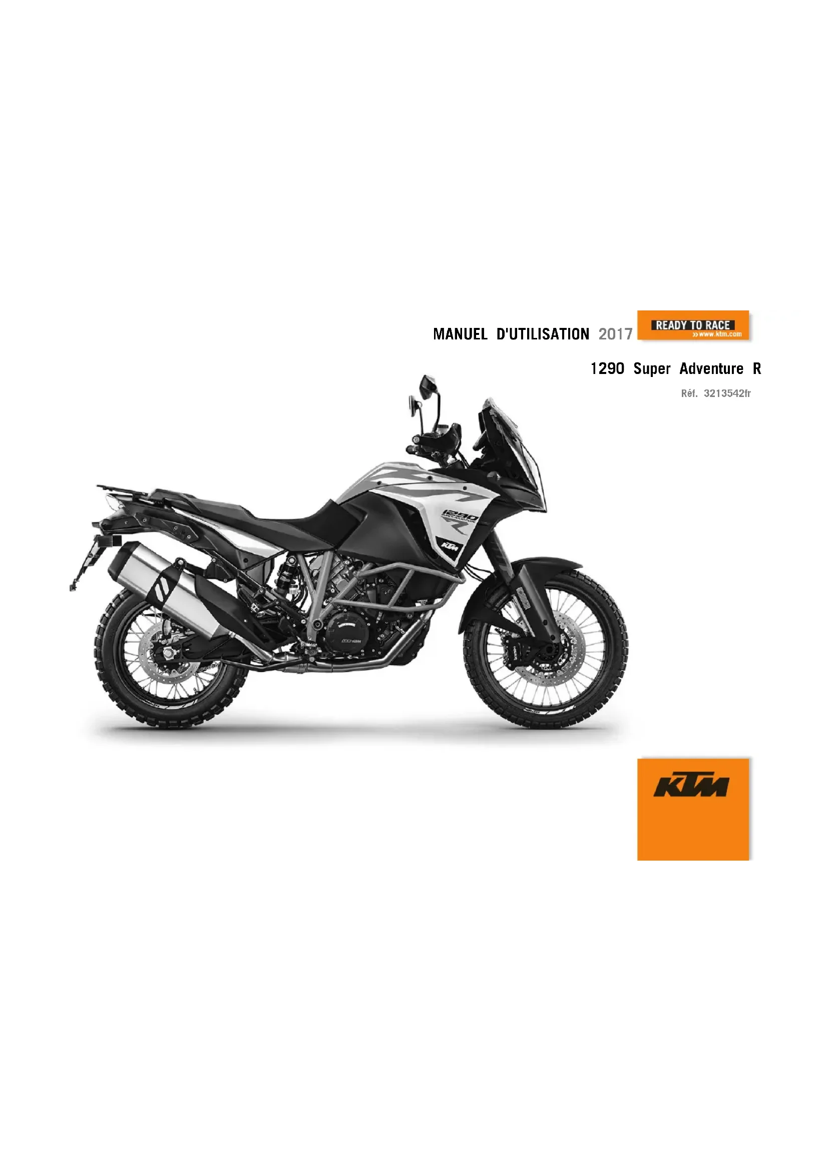 Permettez-nous de vous féliciter sincèrement d’avoir porté votre choix sur une moto KTM. Vous êtes désormais en possession d'une moto moderne et sportive qui vous apportera beaucoup de plaisir si vous appliquez correctement les instructions de maintenance et d'entretien. Nous vous souhaitons un maximum de plaisir ! Merci de reporter les numéros de série du véhicule ci-dessous. Numéro de châssis ( p. 30) Cachet du concessionnaire Numéro de moteur ( p. 32) Numéro de clé ( p. 31) Le présent manuel d'utilisation correspond à l'état de la série concernée au moment de la publication. Cependant, des divergences minimes résultant du perfectionnement de la construction ne sauraient être exclues. Toutes les informations du présent document sont fournies sans aucun engagement. La société KTM Sportmotorcycle GmbH se réserve le droit de modifier, de supprimer sans substitution ou d'adapter aux exigences locales les informations techniques, les tarifs, les couleurs, le design, les matériaux, les prestations de services et de maintenance, les constructions et les équipements ou autres, ainsi que d'arrêter définitivement la fabrication d'un certain modèle sans avis préalable ni indication d'un motif quelconque. KTM décline toute responsabi- lité en ce qui concerne les possibilités de livraison, les divergences au niveau des croquis et des descriptions, ainsi que les fautes d'im- pression et les erreurs. Les modèles reproduits dans le présent document sont partiellement pourvus d'équipements spéciaux ne faisant pas partie de l'équipement de série.CHER CLIENT KTM 2 © 2017 KTM Sportmotorcycle GmbH, Mattighofen Autriche Tous droits réservés Toute reproduction, même partielle, est strictement interdite sans autorisation écrite de l'auteur. ISO 9001(12 100 6061) Conformément à la norme internationale de qualité ISO 9001, KTM utilise des standards d'assurance qualité permettant d'obtenir une qualité maximale du produit. Établi par : TÜV Management Service KTM Sportmotorcycle GmbH 5230 Mattighofen, Autriche Ce document est valable pour les modèles suivants : 1290 Super Adventure R TKC US (F9975Q6)SOMMAIRE 3 SOMMAIRE 1 SYMBOLIQUE................................................................. 9