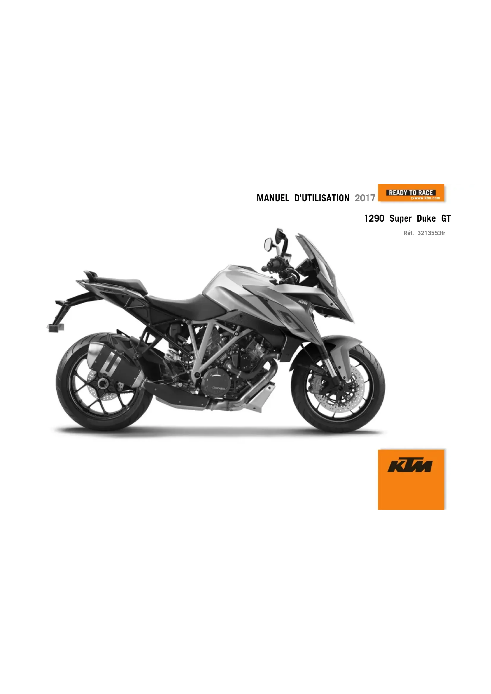 MANUEL D'UTILISATION 2017 1290 Super Duke GT Réf. 3213553frCHER CLIENT KTM, 1 *3213553fr* 3213553fr 10/2016 CHER CLIENT KTM, Permettez-nous de vous féliciter sincèrement d'avoir porté votre choix sur une moto KTM. Vous êtes désormais en possession d'une moto moderne et sportive qui vous apportera beaucoup de plaisir si vous appliquez correctement les instructions de maintenance et d'entretien. Nous vous souhaitons un maximum de plaisir ! Merci de reporter les numéros de série du véhicule ci-dessous. Numéro de châssis ( p. 26) Cachet du concessionnaire Numéro de moteur ( p. 28) Numéro de clé ( p. 27) Le présent manuel d'utilisation correspond à l'état le plus avancé de la série concernée au moment de l'impression. Cependant, des diver- gences minimes résultant de l'évolution technique ne sauraient être exclues. Toutes les informations du présent document sont fournies sans aucun engagement. La société KTM Sportmotorcycle GmbH se réserve le droit de modifier, de supprimer sans substitution ou d'adapter aux exigences locales les informations techniques, les tarifs, les couleurs, le design, les matériaux, les prestations de services et de maintenance, les constructions et les équipements ou autres, ainsi que d'arrêter définitivement la fabrication d'un certain modèle sans avis préalable ni indication d'un motif quelconque. KTM décline toute responsabi- lité en ce qui concerne les possibilités de livraison, les divergences au niveau des croquis et des descriptions, ainsi que les fautes d'im- pression et les erreurs. Les modèles représentés dans le présent document sont en partie dotés d'équipements spéciaux qui ne font pas partie de l'équipement de série.CHER CLIENT KTM, 2 © 2016 KTM Sportmotorcycle GmbH, Mattighofen Autriche Tous droits réservés Toute reproduction, même partielle, est strictement interdite sans autorisation écrite de l'auteur. ISO 9001(12 100 6061) Conformément à la norme internationale de qualité ISO 9001, KTM utilise des standards d'assurance qualité permettant d'obtenir une qualité maximale du produit. Établi par : TÜV Management Service KTM Sportmotorcycle GmbH 5230 Mattighofen, Autriche Ce document est valable pour les modèles suivants : 1290 Super Duke GT US (F9975QE, F9975QF)SOMMAIRE 3 SOMMAIRE 1 SYMBOLIQUE................................................................. 8