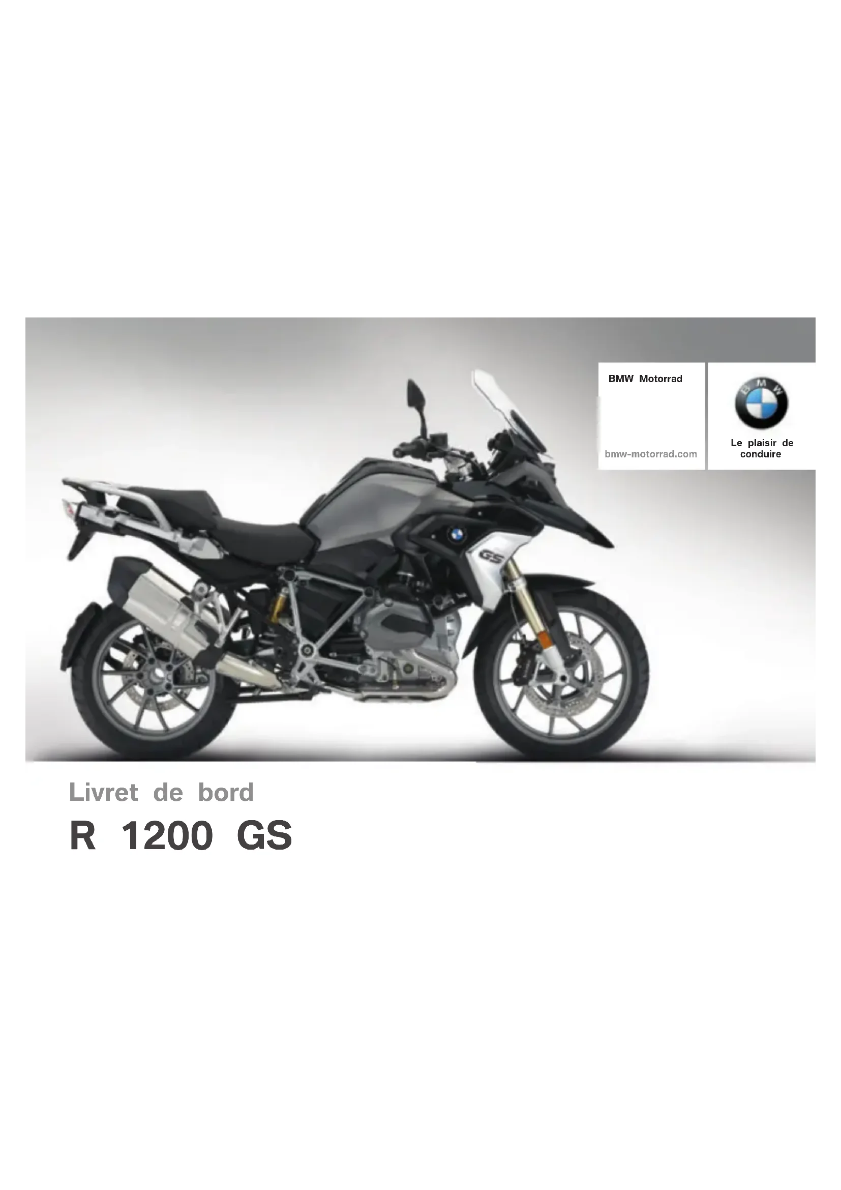 Livret de bord R 1200 GS BMW Motorrad bmw‑motorrad.com Le plaisir de conduireDonnées moto / concessionnaire Données de la moto Modèle Numéro d'identification du véhicule Code couleur Première immatriculation N° d'immatriculation Données du concessionnaire Interlocuteur au service après-vente Madame/Monsieur N° de téléphone Adresse du concessionnaire/Téléphone (cachet de la société)Bienvenue dans le monde de BMW Nous vous félicitons d'avoir porté votre choix sur une moto BMW Motorrad et vous accueillons dans le cercle des pilotes BMW. Familiarisez-vous avec votre nouveau véhicule afin d'être en mesure de vous déplacer en toute sécurité sur les routes. À propos de ce livret de bord Veuillez prendre le temps de lire ce livret de bord avant de prendre la route avec votre nou- velle BMW. Vous y trouverez des indications importantes pour l'utilisation de votre véhicule qui vous aideront à exploiter pleine- ment les avantages techniques de votre BMW. Vous trouverez en outre des in- formations sur l'entretien et la maintenance de votre moto qui vous permettront d'en optimiser la fiabilité, la sécurité et la valeur de revente. La justification de l'exécution des travaux de maintenance est une condition préalable à toute pres- tation fournie à titre commercial. Si vous vendez un jour votre BMW, n'oubliez pas de remettre aussi le livret de bord. Il consti- tue un élément important de votre véhicule. Suggestions et critiques Votre concessionnaire BMW Motorrad se fera un plaisir de vous conseiller et de répondre à toutes les questions que vous pourrez lui poser sur votre véhicule. Nous vous souhaitons beaucoup de plaisir au guidon de votre BMW ainsi qu'un bon voyage en toute sécurité BMW Motorrad.
