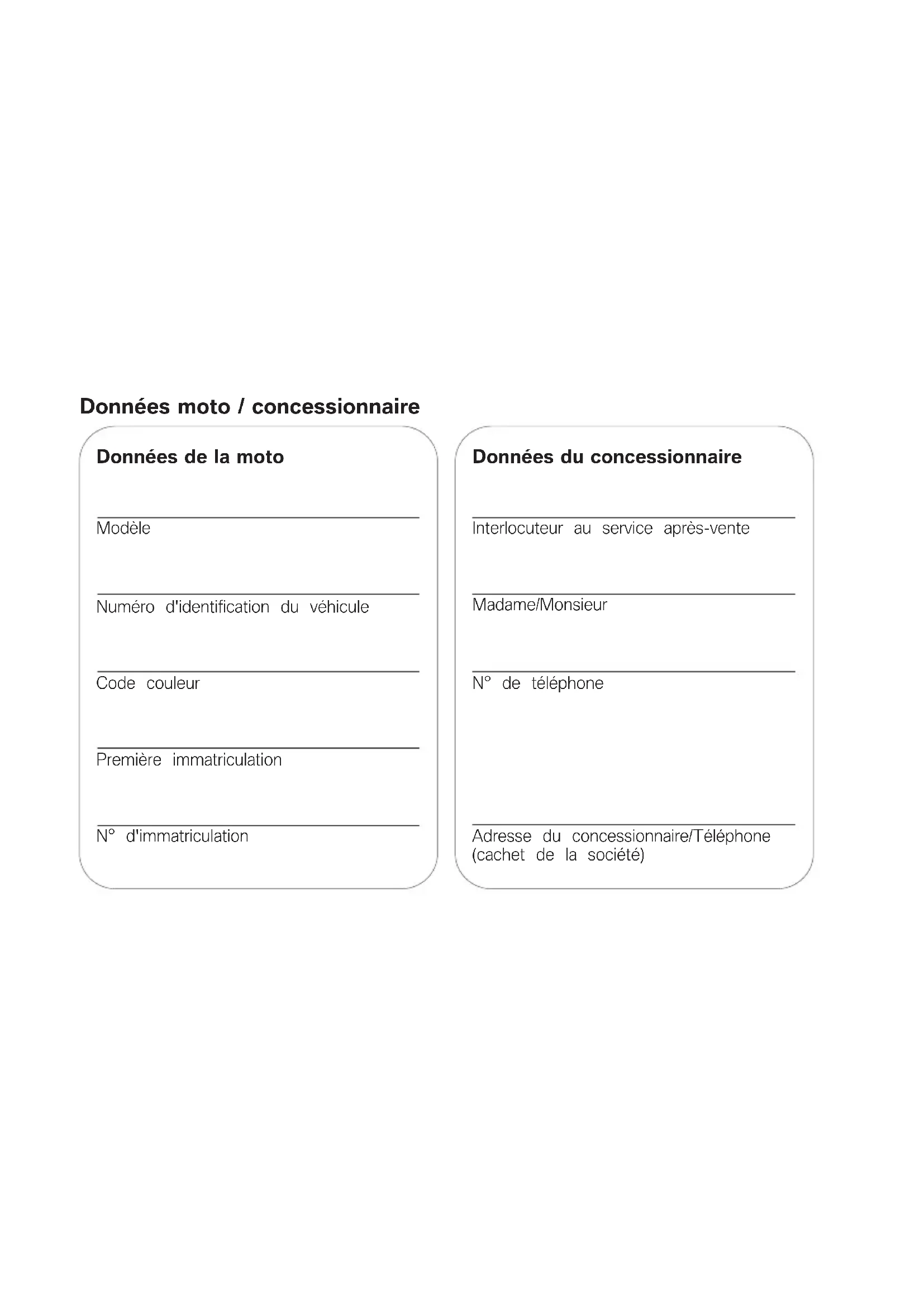 Livret de bord R 1200 R BMW MotorradDonnées moto / concessionnaire Données de la moto Modèle Numéro d'identification du véhicule Code couleur Première immatriculation N° d'immatriculation Données du concessionnaire Interlocuteur au service après-vente Madame/Monsieur N° de téléphone Adresse du concessionnaire/Téléphone (cachet de la société)Bienvenue dans le monde de BMW Nous vous félicitons d'avoir porté votre choix sur une moto BMW Motorrad et vous accueillons dans le cercle des pilotes BMW. Familiarisez-vous avec votre nouveau véhicule afin d'être en mesure de vous déplacer en toute sécurité sur les routes. À propos de ce livret de bord Veuillez prendre le temps de lire ce livret de bord avant de prendre la route avec votre nou- velle BMW. Vous y trouverez des indications importantes pour l'utilisation de votre véhicule qui vous aideront à exploiter pleine- ment les avantages techniques de votre BMW. Vous trouverez en outre des in- formations sur l'entretien et la maintenance de votre moto qui vous permettront d'en optimiser la fiabilité, la sécurité et la valeur de revente. La justification de l'exécution des travaux de maintenance est une condition préalable à toute pres- tation fournie à titre commercial. Si vous vendez un jour votre BMW, n'oubliez pas de remettre aussi le livret de bord. Il consti- tue un élément important de votre véhicule. Suggestions et critiques Votre concessionnaire BMW Motorrad se fera un plaisir de vous conseiller et de répondre à toutes les questions que vous pourrez lui poser sur votre véhicule. Nous vous souhaitons beaucoup de plaisir au guidon de votre BMW ainsi qu'un bon voyage en toute sécurité BMW Motorrad.