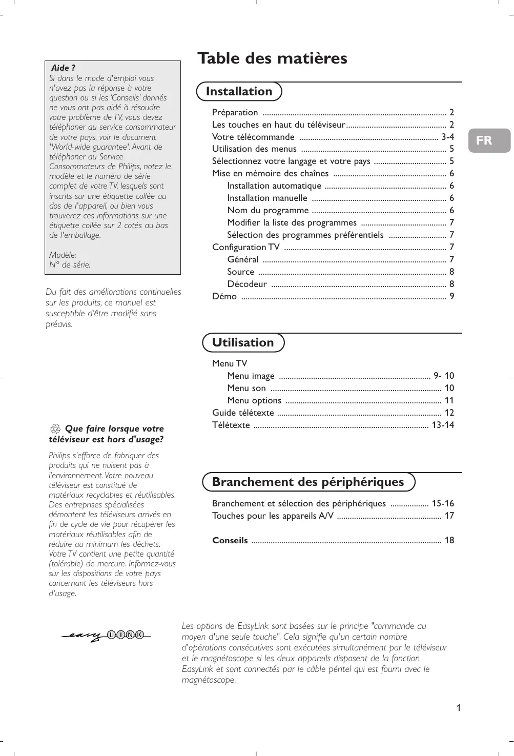 Utilisation R Que faire lorsque votre téléviseur est hors d'usage? Philips s’efforce de fabriquer des produits qui ne nuisent pas à l’environnement. Votre nouveau téléviseur est constitué de matériaux recyclables et réutilisables. Des entreprises spécialisées démontent les téléviseurs arrivés en fin de cycle de vie pour récupérer les matériaux réutilisables afin de réduire au minimum les déchets. Votre TV contient une petite quantité (tolérable) de mercure. Informez-vous sur les dispositions de votre pays concernant les téléviseurs hors d'usage. Branchement des périphériques Branchement et sélection des périphériques .................. 15-16 Touches pour les appareils A/V ................................................. 17 Conseils ......................................................................................... 18 Les options de EasyLink sont basées sur le principe "commande au moyen d'une seule touche". Cela signifie qu'un certain nombre d'opérations consécutives sont exécutées simultanément par le téléviseur et le magnétoscope si les deux appareils disposent de la fonction EasyLink et sont connectés par le câble péritel qui est fourni avec le magnétoscope.