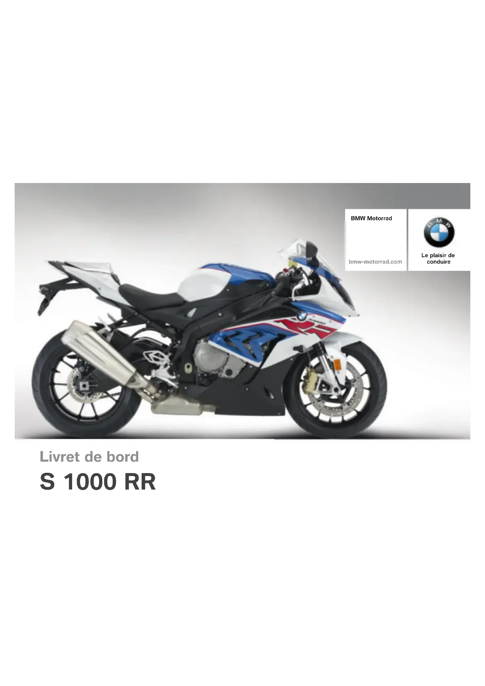 Livret de bord S 1000 RR BMW Motorrad bmw‑motorrad.com Le plaisir de conduireDonnées moto / concessionnaire Données de la moto Modèle Numéro d'identification du véhicule Code couleur Première immatriculation N° d'immatriculation Données du concessionnaire Interlocuteur au service après-vente Madame/Monsieur N° de téléphone Adresse du concessionnaire/Téléphone (cachet de la société)Bienvenue dans le monde de BMW Nous vous félicitons d'avoir porté votre choix sur une moto BMW Motorrad et vous accueillons dans le cercle des pilotes BMW. Familiarisez-vous avec votre nouveau véhicule afin d'être en mesure de vous déplacer en toute sécurité sur les routes. À propos de ce livret de bord Veuillez prendre le temps de lire ce livret de bord avant de prendre la route avec votre nou- velle BMW. Vous y trouverez des indications importantes pour l'utilisation de votre véhicule qui vous aideront à exploiter pleine- ment les avantages techniques de votre BMW. Vous trouverez en outre des in- formations sur l'entretien et la maintenance de votre moto qui vous permettront d'en optimiser la fiabilité, la sécurité et la valeur de revente. La justification de l'exécution des travaux de maintenance est une condition préalable à toute pres- tation fournie à titre commercial. Si vous vendez un jour votre BMW, n'oubliez pas de remettre aussi le livret de bord. Il consti- tue un élément important de votre véhicule. Suggestions et critiques Votre concessionnaire BMW Motorrad se fera un plaisir de vous conseiller et de répondre à toutes les questions que vous pourrez lui poser sur votre véhicule. Nous vous souhaitons beaucoup de plaisir au guidon de votre BMW ainsi qu'un bon voyage en toute sécurité BMW Motorrad.