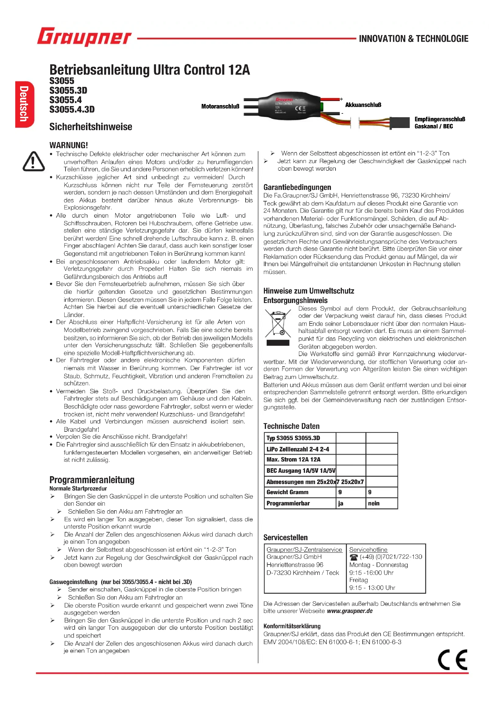 Garantie Graupner / SJ GmbH, Henriettenstraße 96, 73230 Kirchheim / Teck ga-rantit le produit de la date d’achat pour une période de 24 mois. La garan-tie couvre les défauts dans le fonctionnement ou dans les matériaux déjà existants au moment de l’achat. Les dommages dus à la négligence, la surcharge, accessoires, utilisation ou traitement mauvaises, sont exclus de la garantie. Les droits juridiques et la garantie du consommateur ne sont pas limités par cette garantie. S’il vous plaît vérifiez vous exactement les dommages avant de réclamer ou envoyer le produit, parce que si l’élément s’avère en bon état, nous devrions encore vous facturer les frais d’expé-dition. Notes pour la protection de l’environnement Élimination Le symbole, qui figure sur le produit, dans la notice ou sur l’emballage indique que cet article ne peut pas être jeté aux or-dures ménagères en fin de vie. Il doit être remis à une collecte pour le recyclage des appareils électriques et électroniques.Selon leur marquage, les matériaux sont recyclables. Avec ce recyclage, sous quelque forme que ce soit, vous participez de manière significative, à la protection de l’environnement.Les piles et accus doivent être retirés des appareils, et remis à un centre de tri approprié. Renseignez-vous auprès de votre commune pour connaître les centres de collecte et de tri compétents. Données techniques Type S3055 S3055.3DNombre de cellules LiPo 2-4 2-4Courant maximal 12A 12ASortie BEC 1A/5V 1A/5VDimensions mm 25x20x7 25x20x7Poids Grammes 9 9Programmable oui non Centre de service Graupner/SJ-ZentralserviceGraupner/SJ GmbHHenriettenstrasse 96D-73230 Kirchheim / TeckServicehotline (+49) (0)7021/722-130Lun - Jeu9:15 -16:00 Vendredi9:15 - 13:00 Les adresses des centres de service à l’étranger sont disponibles à la page www.graupner.deDéclaration de conformitéGraupner/SJ déclare que le produit est conforme aux normes CE.EMV 2004/108/EC: EN 61000-6-1; EN 61000-6-3Italiano INNOVATION & TECHNOLOGIE ATTENZIONE!