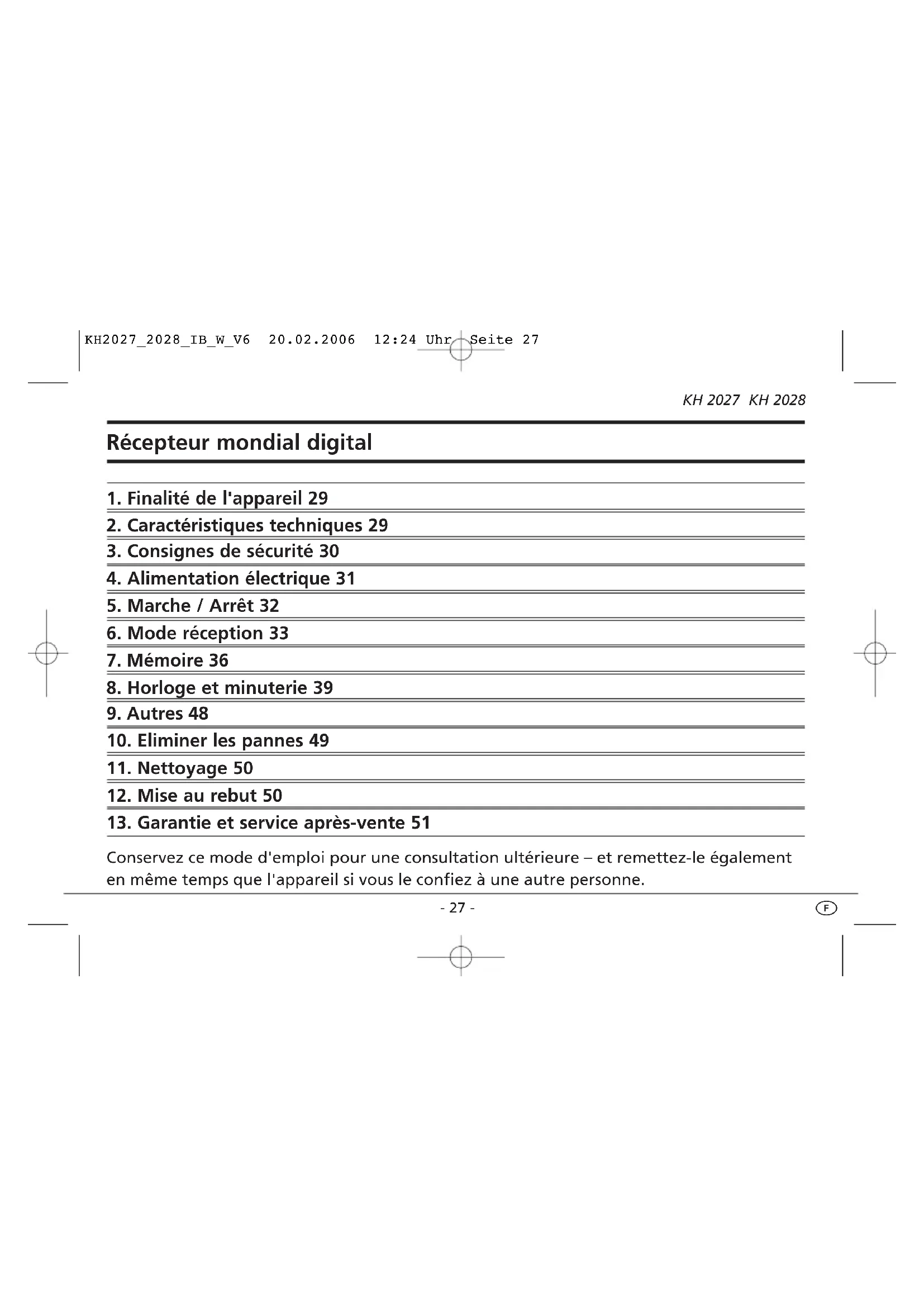Cet appareil est prévu pour la réception dans tous les pays d'émissions radio générale- ment autorisées (récepteur mondial) et uniquement à utilisation domestique. Il n'est pas destiné à la réception d'émissions radio non autorisées de manière générale, ni comme élément d'équipements radioélectriques de sécurité, par exemple à bord de bateaux de sport, et n'est pas destiné à une utilisation commerciale ou industrielle. Par ailleurs, il n'est pas destiné à être utilisé dans des zones climatiques hors des limites fixées par les données techniques. KH 2027 KH 2028