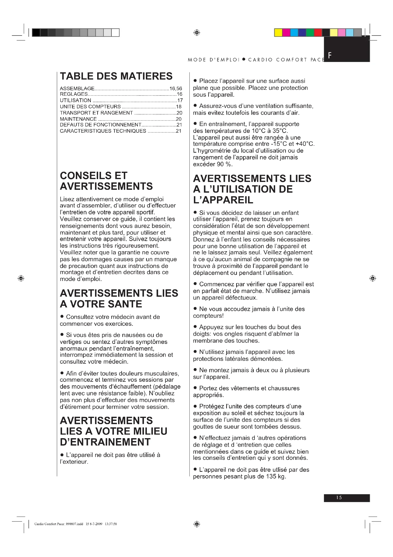 Lisez attentivement ce mode d'emploi avant d'assembler, d'utiliser ou d'effectuer l'entretien de votre apparéil sportif.