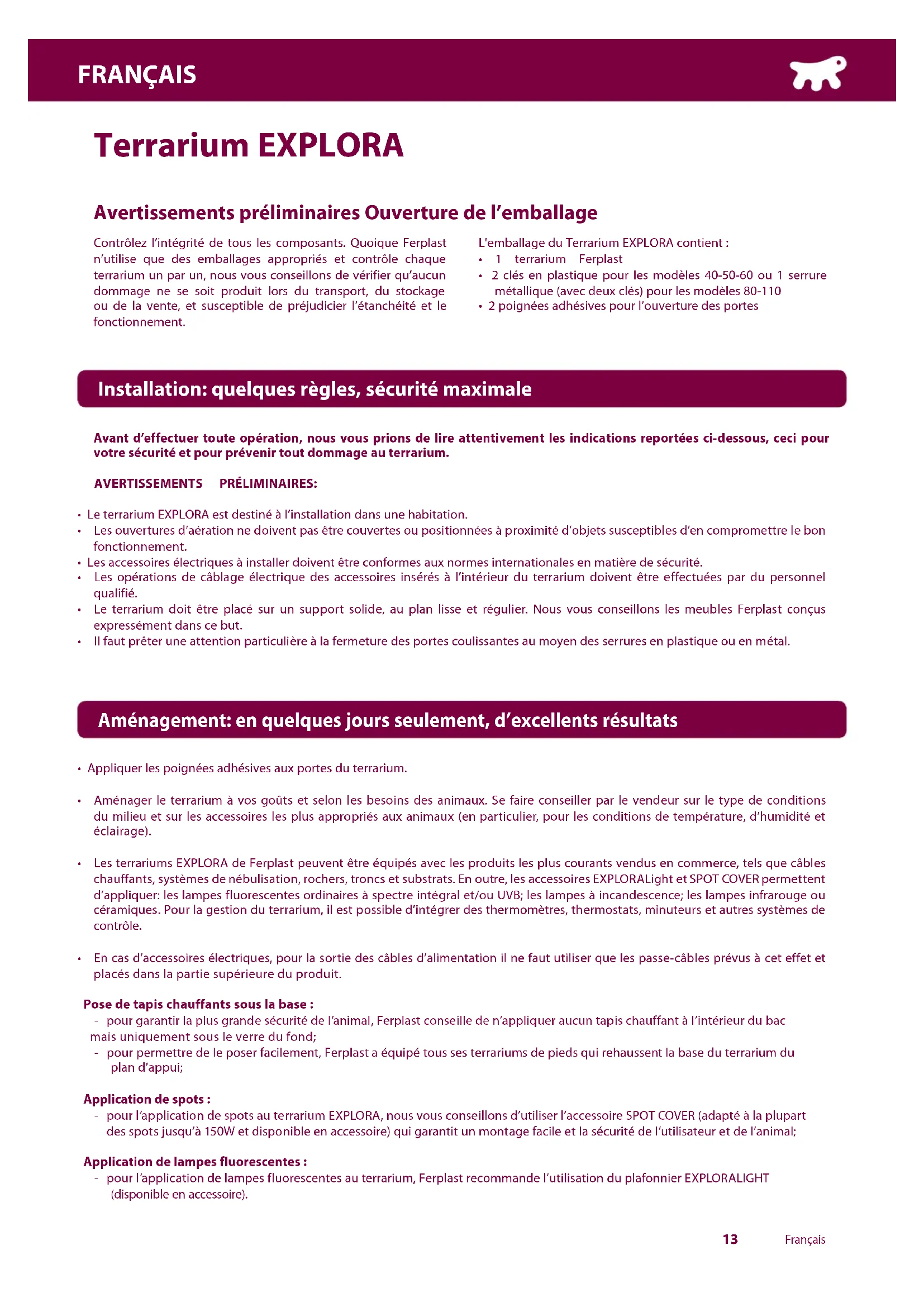 - pour l'application de lampes fluorescentes au terrarium, Ferplast recommande l'utilisation du plafonnier EXPLORALIGHT (disponible en accessoire).