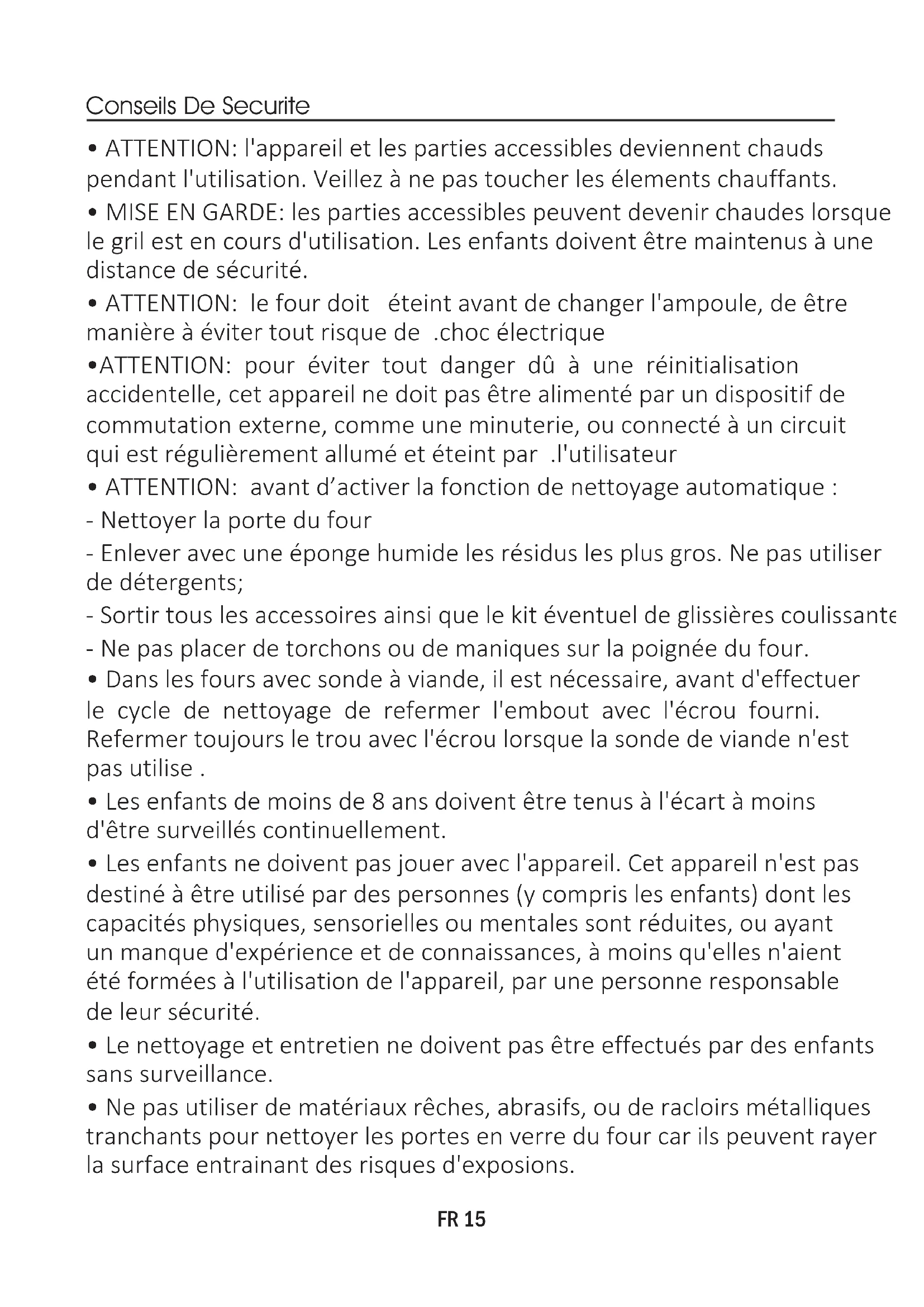 - Ne pas utiliser de matériaux rêches, abrasifs, ou de racloirs métalliques tranchants pour nettoyer les portes en verre du four car ils peuvent rayer la surface entrainant des risques d'exposions. FR 15 Conseils De Securite•Le four doit être éteint avant le démontage des accessoires. Après nettoyage, remonter les accessoires en suivant les instructions.