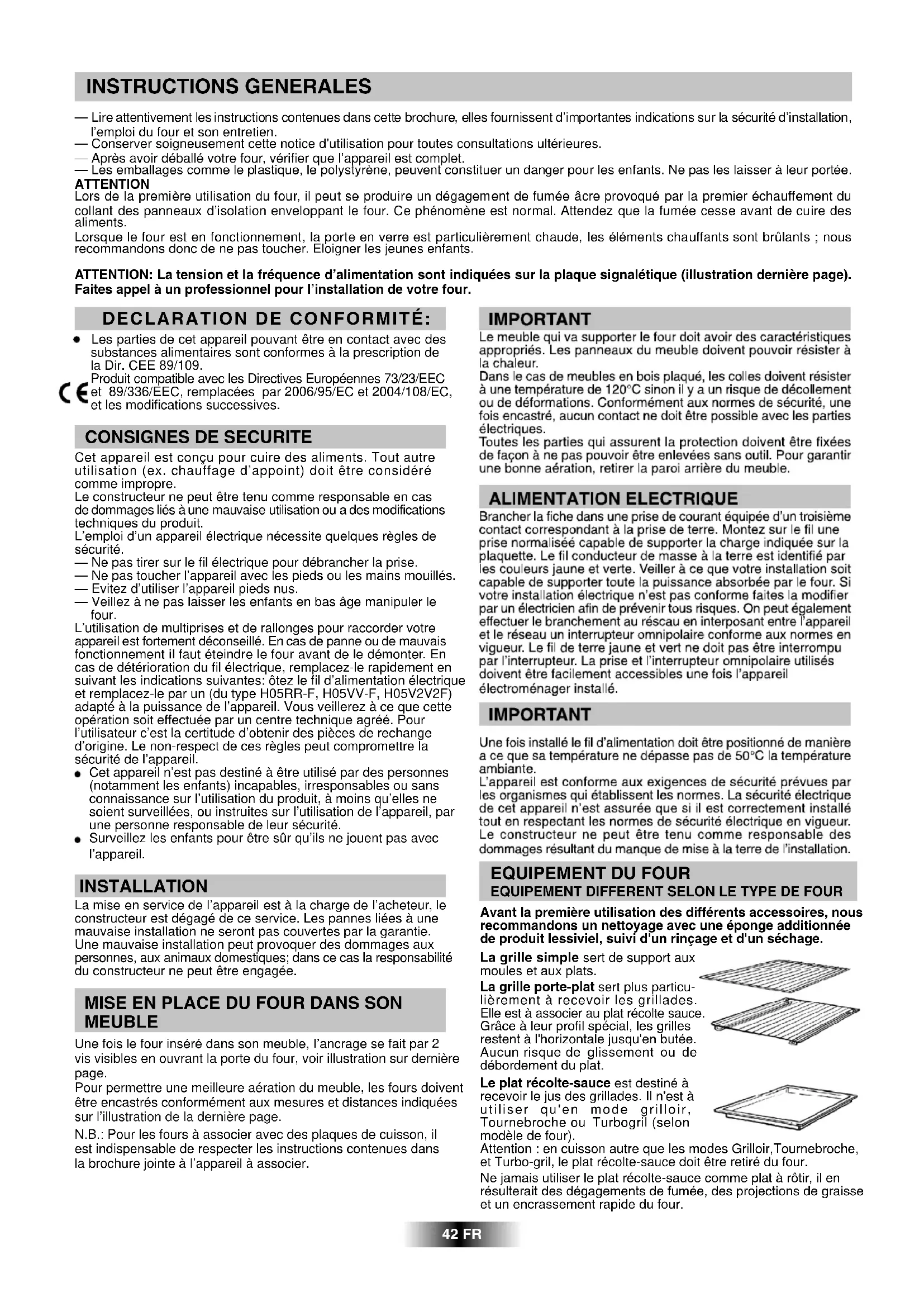 Cet appareil est conçu pour cuire des aliments. Tout autre utilisation (ex. chauffage d’appoint) doit être considéré comme impropre. Le constructeur ne peut être tenu comme responsable en cas de dommages liés à une mauvaise utilisation ou a des modifications techniques du produit. L’emploi d’un appareil électrique nécessite quelques règles de sécurité. — Ne pas tirer sur le fil électrique pour débrancher la prise. — Ne pas toucher l’appareil avec les pieds ou les mains mouillés. — Evitez d’utiliser l’appareil pieds nus. — Veillez à ne pas laisser les enfants en bas âge manipuler le four. L’utilisation de multiprises et de rallonges pour raccorder votre appareil est fortement déconseillé. En cas de panne ou de mauvais fonctionnement il faut éteindre le four avant de le démonter. En cas de détérioration du fil électrique, remplacez-le rapidement en suivant les indications suivantes: ôtez le fil d’alimentation électrique et remplacez-le par un (du type H05RR-F, H05VV-F, H05V2V2F) adapté à la puissance de l’appareil. Vous veillerez à ce que cette opération soit effectuée par un centre technique agréé. Pour l’utilisateur c’est la certitude d’obtenir des pièces de rechange d’origine. Le non-respect de ces règles peut compromettre la sécurité de l’appareil. Cet appareil n’est pas destiné à être utilisé par des personnes (notamment les enfants) incapables, irresponsables ou sans connaissance sur l’utilisation du produit, à moins qu’elles ne soient surveillées, ou instruites sur l’utilisation de l’appareil, par une personne responsable de leur sécurité. Surveillez les enfants pour être sûr qu’ils ne jouent pas avec l’appareil. INSTALLATION La mise en service de l’appareil est à la charge de l’acheteur, le constructeur est dégagé de ce service. Les pannes liées à une mauvaise installation ne seront pas couvertes par la garantie. Une mauvaise installation peut provoquer des dommages aux personnes, aux animaux domestiques; dans ce cas la responsabilité du constructeur ne peut être engagée. MISE EN PLACE DU FOUR DANS SON MEUBLE Une fois le four inséré dans son meuble, I’ancrage se fait par 2 vis visibles en ouvrant la porte du four, voir illustration sur dernière page. Pour permettre une meilleure aération du meuble, les fours doivent être encastrés conformément aux mesures et distances indiquées sur l’illustration de la dernière page. N.B.: Pour les fours à associer avec des plaques de cuisson, il est indispensable de respecter les instructions contenues dans la brochure jointe à l’appareil à associer. 42 FR