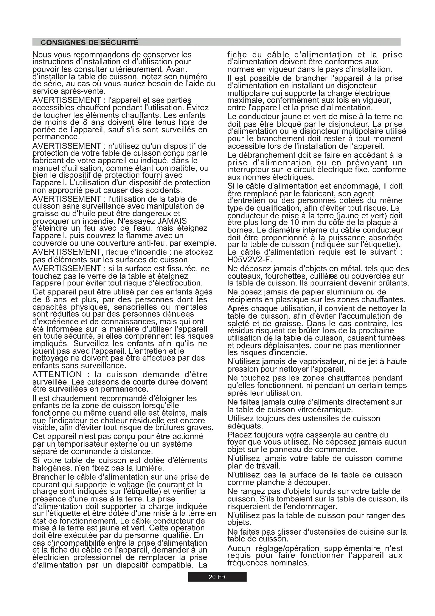 cuisson sans surveillance avec manipulation de graisse ou d'huile peut être dangereux et provoquer un incendie. N'essayez JAMAIS d'éteindre un feu avec de l'eau, mais éteignez l'appareil, puis couvrez la flamme avec un couvercle ou une couverture anti-feu, par exemple. Il est chaudement recommandé d'éloigner les enfants de la zone de cuisson lorsqu'elle fonctionne ou même quand elle est éteinte, mais que l'indicateur de chaleur résiduelle est encore visible, afin d'éviter tout risque de brûlures graves. Cet appareil peut être utilisé par des enfants âgés de 8 ans et plus, par des personnes dont les capacités physiques, sensorielles ou mentales sont réduites ou par des personnes dénuées d'expérience et de connaissances, mais qui ont été informées sur la manière d'utiliser l'appareil en toute sécurité, si elles comprennent les risques impliqués. Surveillez les enfants afin qu'ils ne jouent pas avec l'appareil. L'entretien et le nettoyage ne doivent pas être effectués par des enfants sans surveillance. Si votre table de cuisson est dotée d'éléments halogènes, n'en fixez pas la lumière. Brancher le câble d'alimentation sur une prise de courant qui supporte le voltage (le courant et la charge sont indiqués sur l'étiquette) et vérifier la présence d'une mise à la terre. La prise d'alimentation doit supporter la charge indiquée sur l'étiquette et être dotée d'une mise à la terre en état de fonctionnement. Le câble conducteur de mise à la terre est jaune et vert. Cette opération doit être exécutée par du personnel qualifié. En cas d'incompatibilité entre la prise d'alimentation et la fiche du câble de l'appareil, demander à un électricien professionnel de remplacer la prise d'alimentation par un dispositif compatible. La ATTENTION : la cuisson demande d'être surveillée. Les cuissons de courte durée doivent être surveillées en permanence.
