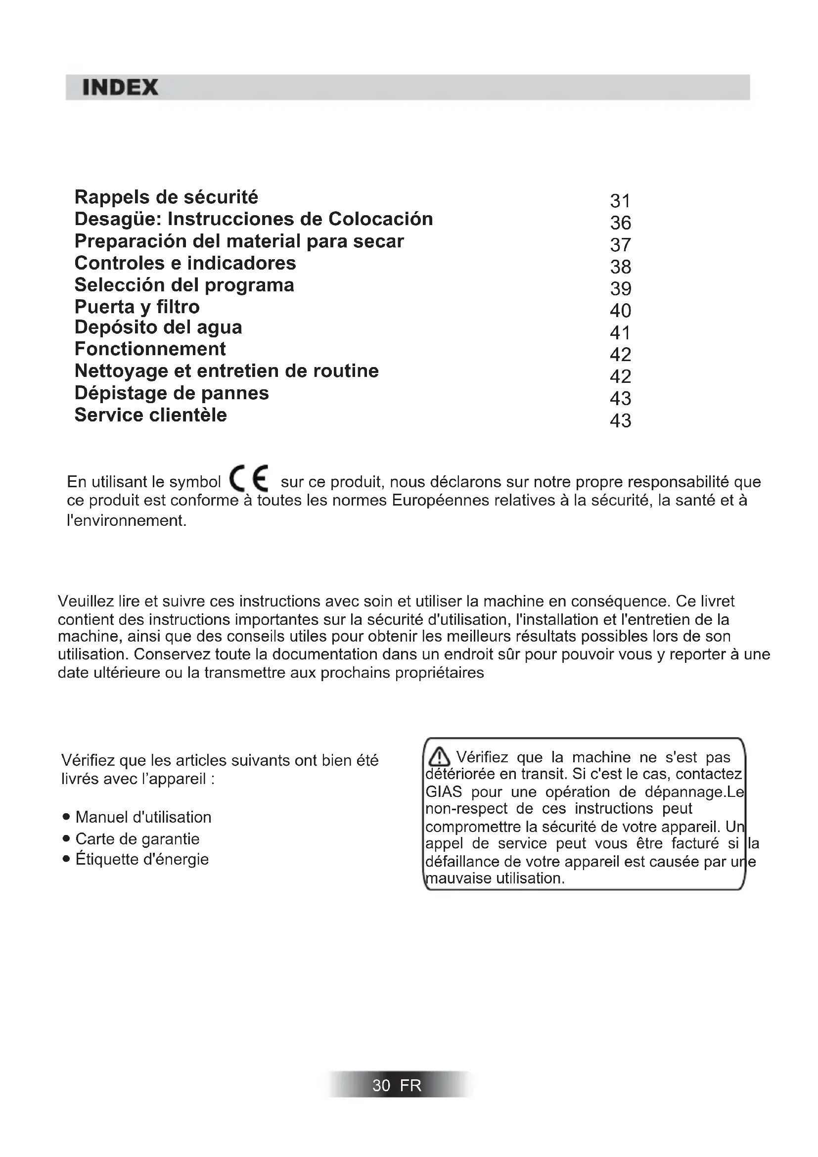 Advertencias sobre seguridad Desagüe: Instrucciones de Colocación Preparación del material para secar Controles e indicadores Selección del programa Puerta y filtro Depósito del agua Operación Limpieza y mantenimiento de rutina Resolución de problemas Servicio de atención al cliente30 FR Veuillez lire et suivre ces instructions avec soin et utiliser la machine en conséquence. Ce livret contient des instructions importantes sur la sécurité d'utilisation, l'installation et l'entretien de la machine, ainsi que des conseils utiles pour obtenir les meilleurs résultats possibles lors de son utilisation. Conservez toute la documentation dans un endroit sûr pour pouvoir vous y reporter à une date ultérieure ou la transmettre aux prochains propriétaires Vérifiez que les articles suivants ont bien été livrés avec l’appareil : ● Manuel d'utilisation ● Carte de garantie ● Étiquette d'énergie Vérifiez que la machine ne s'est pas détériorée en transit. Si c'est le cas, contactez GIAS pour une opération de dépannage.Le non-respect de ces instructions peut compromettre la sécurité de votre appareil. Un appel de service peut vous être facturé si la défaillance de votre appareil est causée par une mauvaise utilisation.