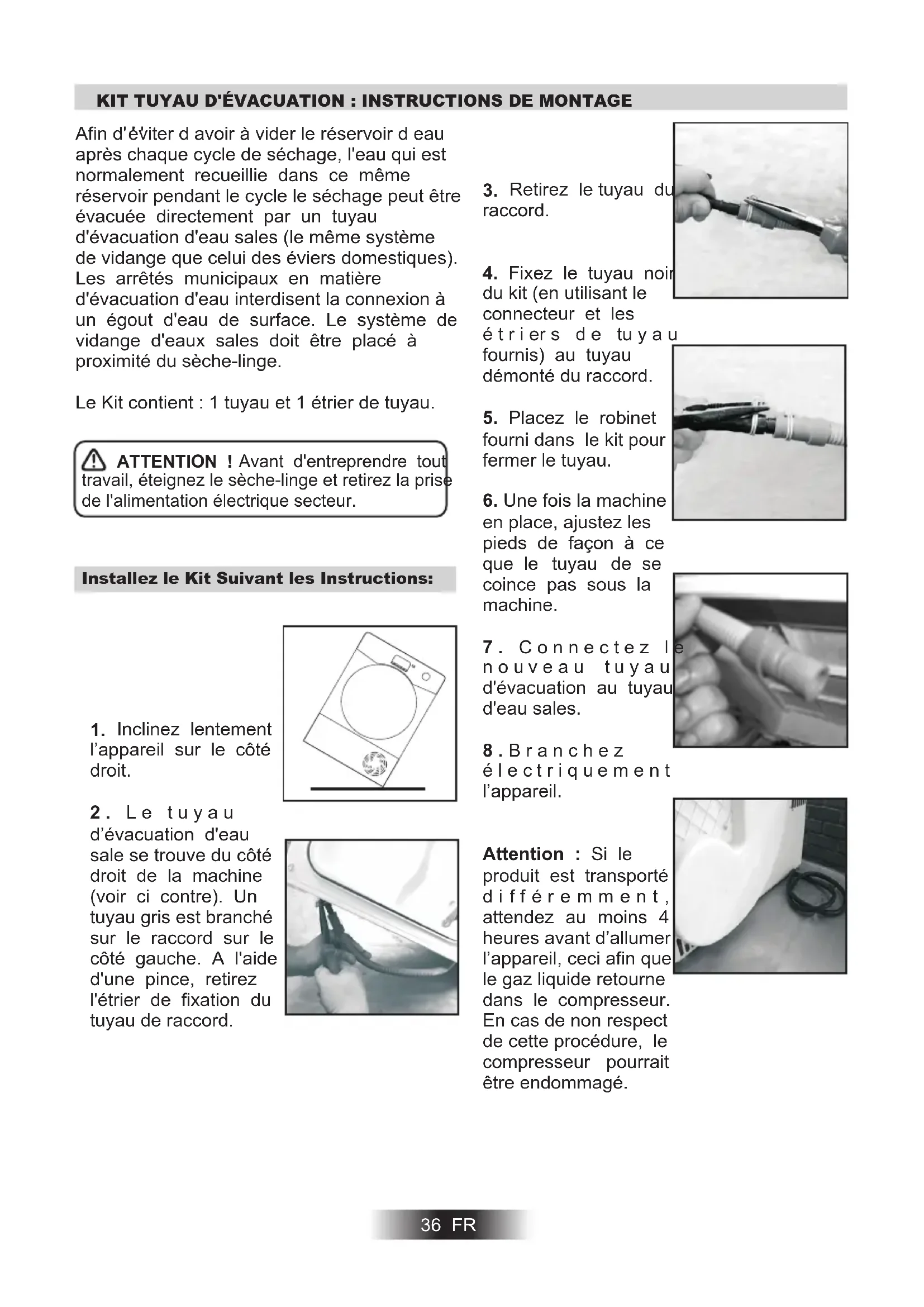 ATTENTION ! travail, éteignez le sèche-linge et retirez la prise de l'alimentation électrique secteur. Avant d'entreprendre tout Installez le Kit Suivant les Instructions: