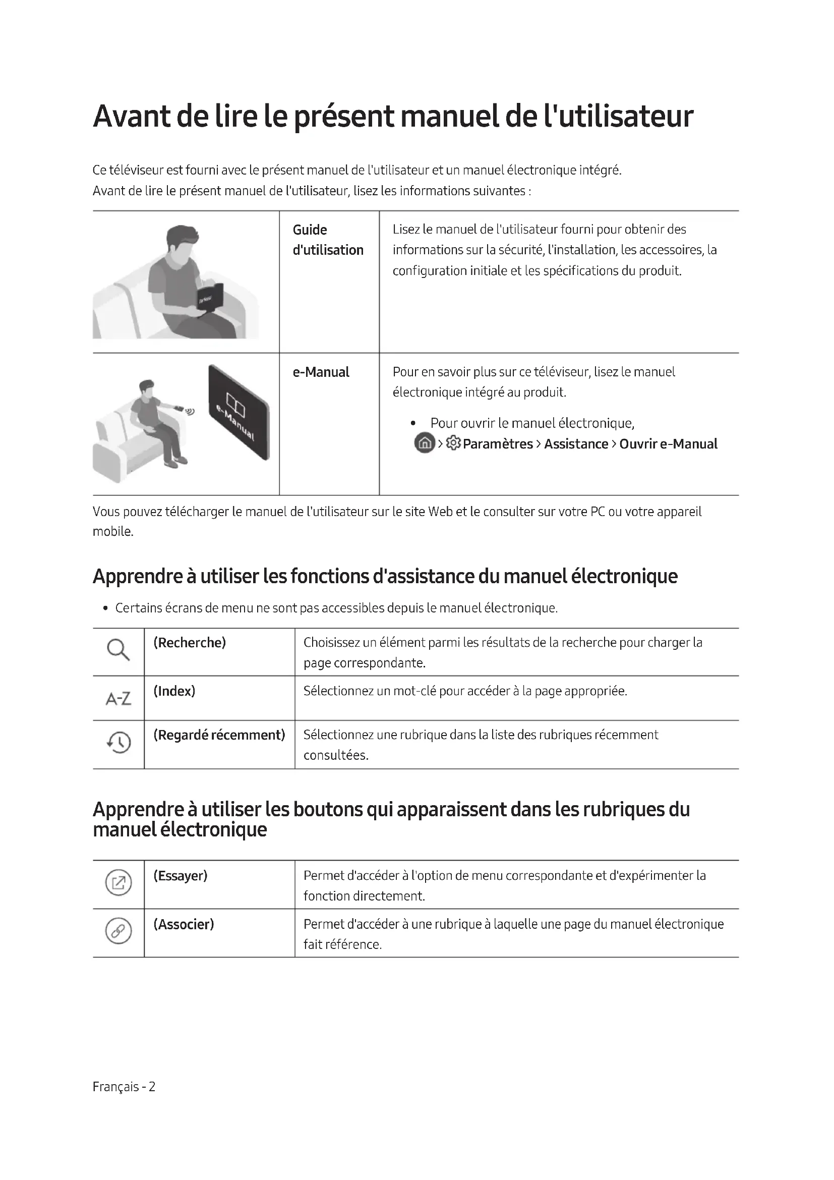 - Pour ouvrir le manuel électronique, > Paramètres > Assistance > Ouvrir e-Manual Vous pouvez télécharger le manuel de l'utilisateur sur le site Web et le consulter sur votre PC ou votre appareil mobile. Apprendre à utiliser les fonctions d'assistance du manuel électronique