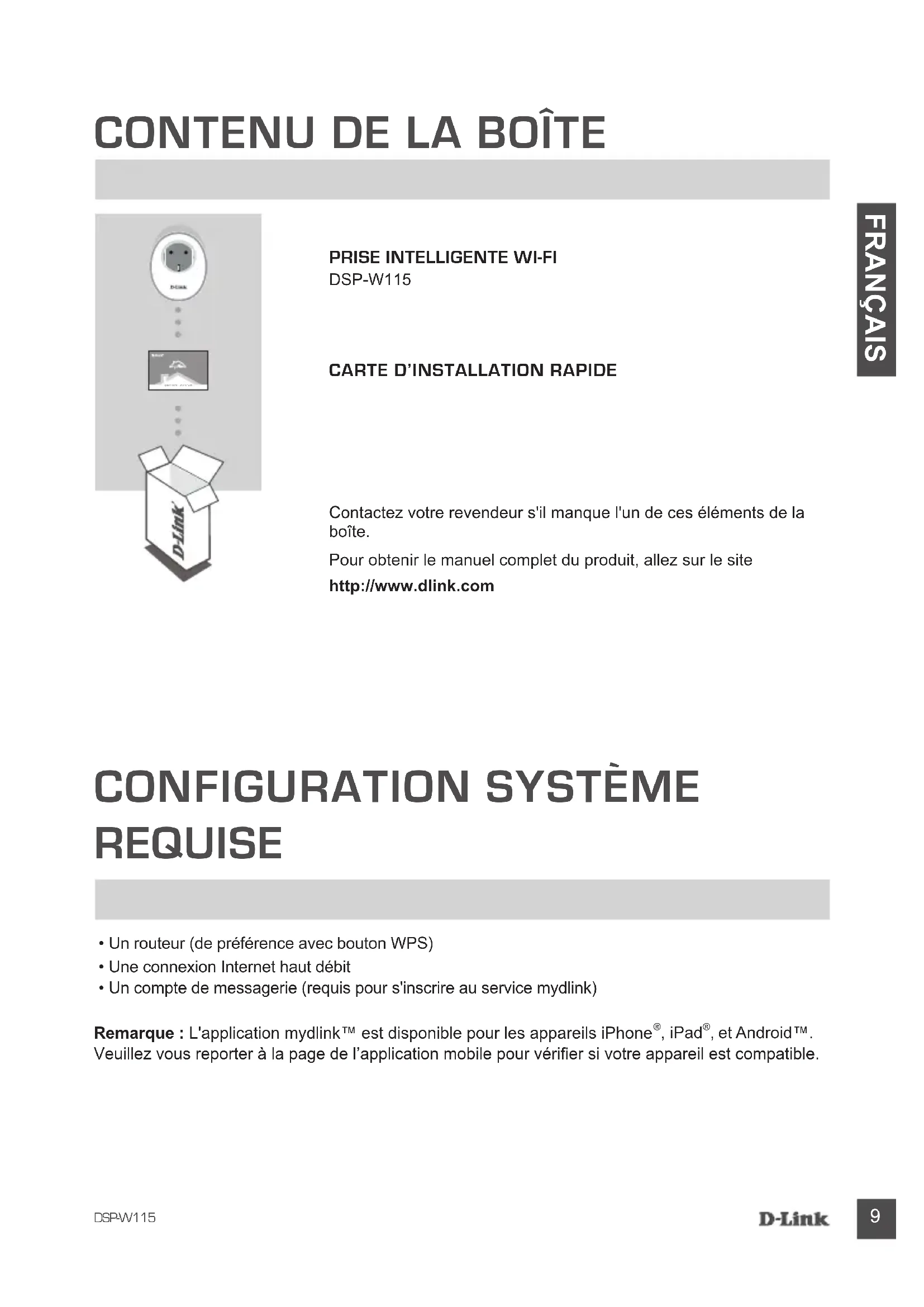 , et Android™. Veuillez vous reporter à la page de l’application mobile pour vérier si votre appareil est compatible. Contactez votre revendeur s'il manque l'un de ces éléments de la boîte. Pour obtenir le manuel complet du produit, allez sur le site http://www.dlink.com