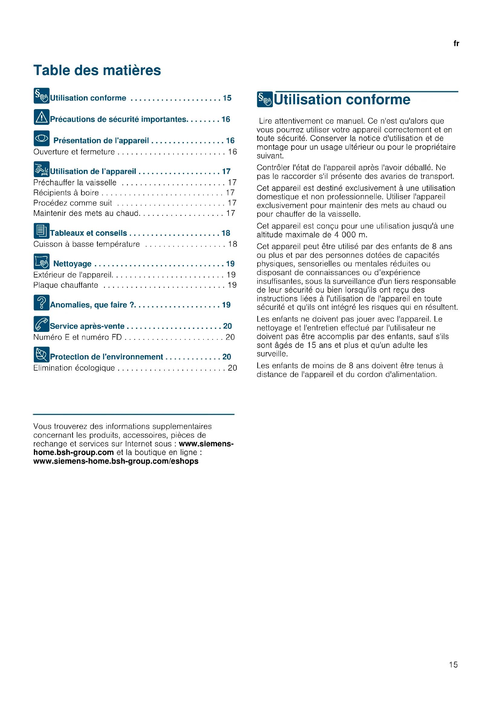 - Présentation de l'appareil . . . . . . . . . . . . . . . . . 16 Ouverture et fermeture . . . . . . . . . . . . . . . . . . . . . . . . 16 1 Utilisation de l’appareil . . . . . . . . . . . . . . . . . . . 17 Préchauffer la vaisselle . . . . . . . . . . . . . . . . . . . . . . . 17 Récipients à boire . . . . . . . . . . . . . . . . . . . . . . . . . . . 17 Procédez comme suit . . . . . . . . . . . . . . . . . . . . . . . . 17 Maintenir des mets au chaud. . . . . . . . . . . . . . . . . . . 17 J Tableaux et conseils . . . . . . . . . . . . . . . . . . . . . 18 Cuisson à basse température . . . . . . . . . . . . . . . . . . 18 D Nettoyage . . . . . . . . . . . . . . . . . . . . . . . . . . . . . . 19 Extérieur de l'appareil. . . . . . . . . . . . . . . . . . . . . . . . . 19 Plaque chauffante . . . . . . . . . . . . . . . . . . . . . . . . . . . 19 3 Anomalies, que faire ?. . . . . . . . . . . . . . . . . . . . 19 4 Service après-vente . . . . . . . . . . . . . . . . . . . . . . 20 Numéro E et numéro FD . . . . . . . . . . . . . . . . . . . . . . 20 7 Protection de l'environnement . . . . . . . . . . . . . 20 Elimination écologique . . . . . . . . . . . . . . . . . . . . . . . . 20 Produktinfo Vous trouverez des informations supplementaires concernant les produits, accessoires, pièces de rechange et services sur Internet sous : www.siemens- home.bsh-group.com et la boutique en ligne : www.siemens-home.bsh-group.com/eshops 8Utilisation conforme Ut i l i s a t i o n conf or me Lire attentivement ce manuel. Ce n'est qu'alors que vous pourrez utiliser votre appareil correctement et en toute sécurité. Conserver la notice d'utilisation et de montage pour un usage ultérieur ou pour le propriétaire suivant. Contrôler l'état de l'appareil après l'avoir déballé. Ne pas le raccorder s'il présente des avaries de transport. Cet appareil est destiné exclusivement à une utilisation domestique et non professionnelle. Utiliser l'appareil exclusivement pour maintenir des mets au chaud ou pour chauffer de la vaisselle. Cet appareil est conçu pour une utilisation jusqu'à une altitude maximale de 4 000 m. Cet appareil peut être utilisé par des enfants de 8 ans ou plus et par des personnes dotées de capacités physiques, sensorielles ou mentales réduites ou disposant de connaissances ou d’expérience insuffisantes, sous la surveillance d'un tiers responsable de leur sécurité ou bien lorsqu'ils ont reçu des instructions liées à l'utilisation de l'appareil en toute sécurité et qu'ils ont intégré les risques qui en résultent. Les enfants ne doivent pas jouer avec l'appareil. Le nettoyage et l'entretien effectué par l'utilisateur ne doivent pas être accomplis par des enfants, sauf s'ils sont âgés de 15 ans et plus et qu'un adulte les surveille. Les enfants de moins de 8 ans doivent être tenus à distance de l'appareil et du cordon d'alimentation.fr Précautions de sécurité importantes