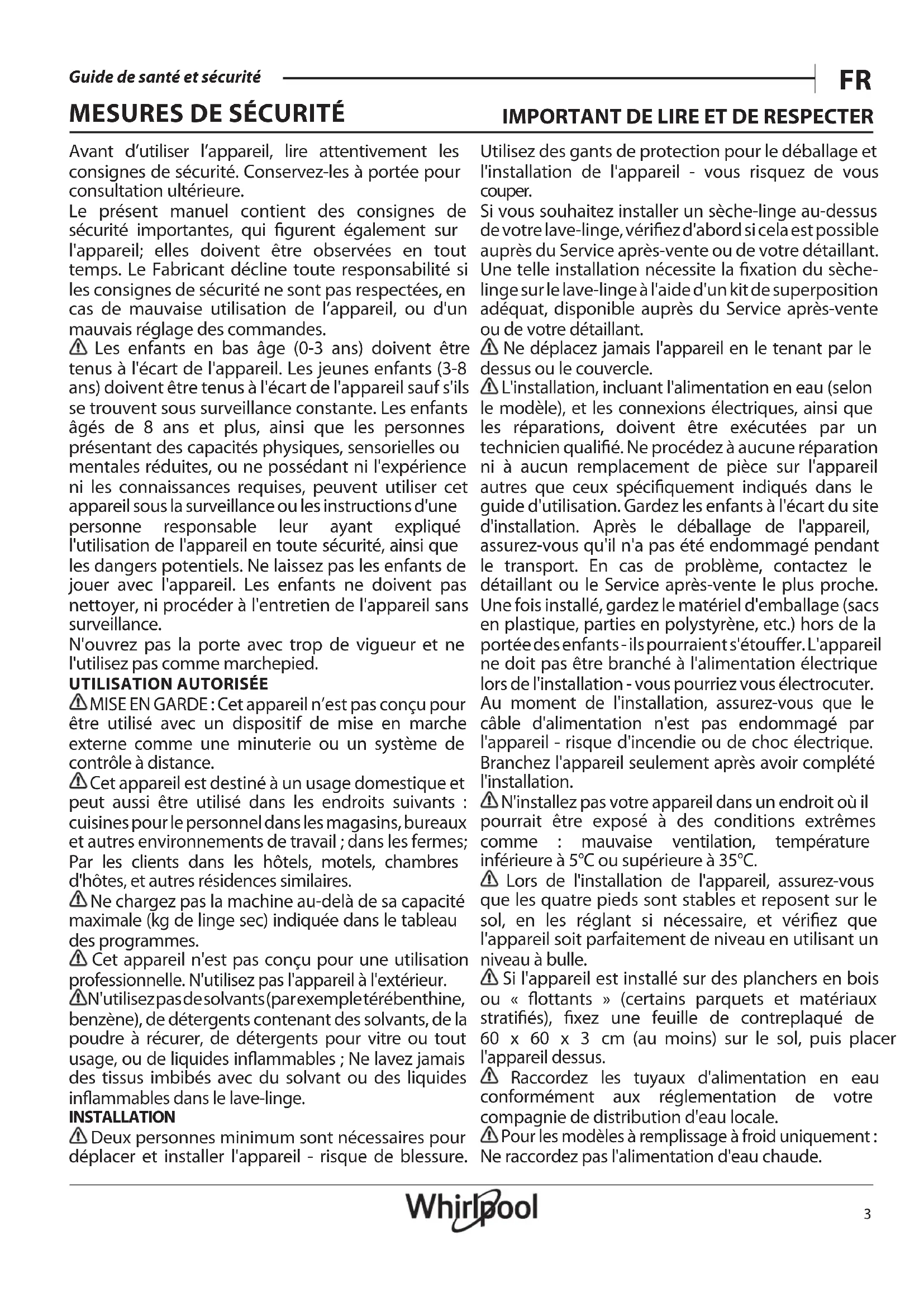 MISE EN GARDE : Cet appareil n’est pas conçu pour être utilisé avec un dispositif de mise en marche externe comme une minuterie ou un système de contrôle à distance. Cet appareil est destiné à un usage domestique et peut aussi être utilisé dans les endroits suivants : cuisines pour le personnel dans les magasins, bureaux et autres environnements de travail; dans les fermes; Par les clients dans les hôtels, motels, chambres d'hôtes, et autres résidences similaires. Ne chargez pas la machine au-delà de sa capacité maximale (kg de linge sec) indiquée dans le tableau des programmes. Cet appareil n'est pas conçu pour une utilisation professionnelle. N'utilisez pas l'appareil à l'extérieur. N'utilisez pas de solvants (par exemple térébenthine, benzène), de détergents contenant des solvants, de la poudre à récurer, de détergents pour vitre ou tout usage, ou de liquides inammables ; Ne lavez jamais des tissus imbibés avec du solvant ou des liquides inammables dans le lave-linge. INSTALLATION Deux personnes minimum sont nécessaires pour déplacer et installer l'appareil - risque de blessure. Utilisez des gants de protection pour le déballage et l'installation de l'appareil - vous risquez de vous couper. Si vous souhaitez installer un sèche-linge au-dessus de votre lave-linge, vériez d'abord si cela est possible auprès du Service après-vente ou de votre détaillant. Une telle installation nécessite la xation du sèche- linge sur le lave-linge à l'aide d'un kit de superposition adéquat, disponible auprès du Service après-vente ou de votre détaillant. Ne déplacez jamais l'appareil en le tenant par le dessus ou le couvercle. L'installation, incluant l'alimentation en eau (selon le modèle), et les connexions électriques, ainsi que les réparations, doivent être exécutées par un technicien qualié. Ne procédez à aucune réparation ni à aucun remplacement de pièce sur l'appareil autres que ceux spéciquement indiqués dans le guide d'utilisation. Gardez les enfants à l'écart du site d'installation. Après le déballage de l'appareil, assurez-vous qu'il n'a pas été endommagé pendant le transport. En cas de problème, contactez le détaillant ou le Service après-vente le plus proche. Une fois installé, gardez le matériel d'emballage (sacs en plastique, parties en polystyrène, etc.) hors de la portée des enfants - ils pourraient s'étouer. L'appareil ne doit pas être branché à l'alimentation électrique lors de l'installation - vous pourriez vous électrocuter. Au moment de l'installation, assurez-vous que le câble d'alimentation n'est pas endommagé par l'appareil - risque d'incendie ou de choc électrique. Branchez l'appareil seulement après avoir complété l'installation. N'installez pas votre appareil dans un endroit où il pourrait être exposé à des conditions extrêmes comme : mauvaise ventilation, température inférieure à 5°C ou supérieure à 35°C. Lors de l'installation de l'appareil, assurez-vous que les quatre pieds sont stables et reposent sur le sol, en les réglant si nécessaire, et vériez que l'appareil soit parfaitement de niveau en utilisant un niveau à bulle. Si l'appareil est installé sur des planchers en bois ou « ottants » (certains parquets et matériaux stratiés), xez une feuille de contreplaqué de 60 x 60 x 3 cm (au moins) sur le sol, puis placer l'appareil dessus. Raccordez les tuyaux d'alimentation en eau conformément aux réglementation de votre compagnie de distribution d'eau locale. Pour les modèles à remplissage à froid uniquement : Ne raccordez pas l'alimentation d'eau chaude.Guide de santé et sécurité