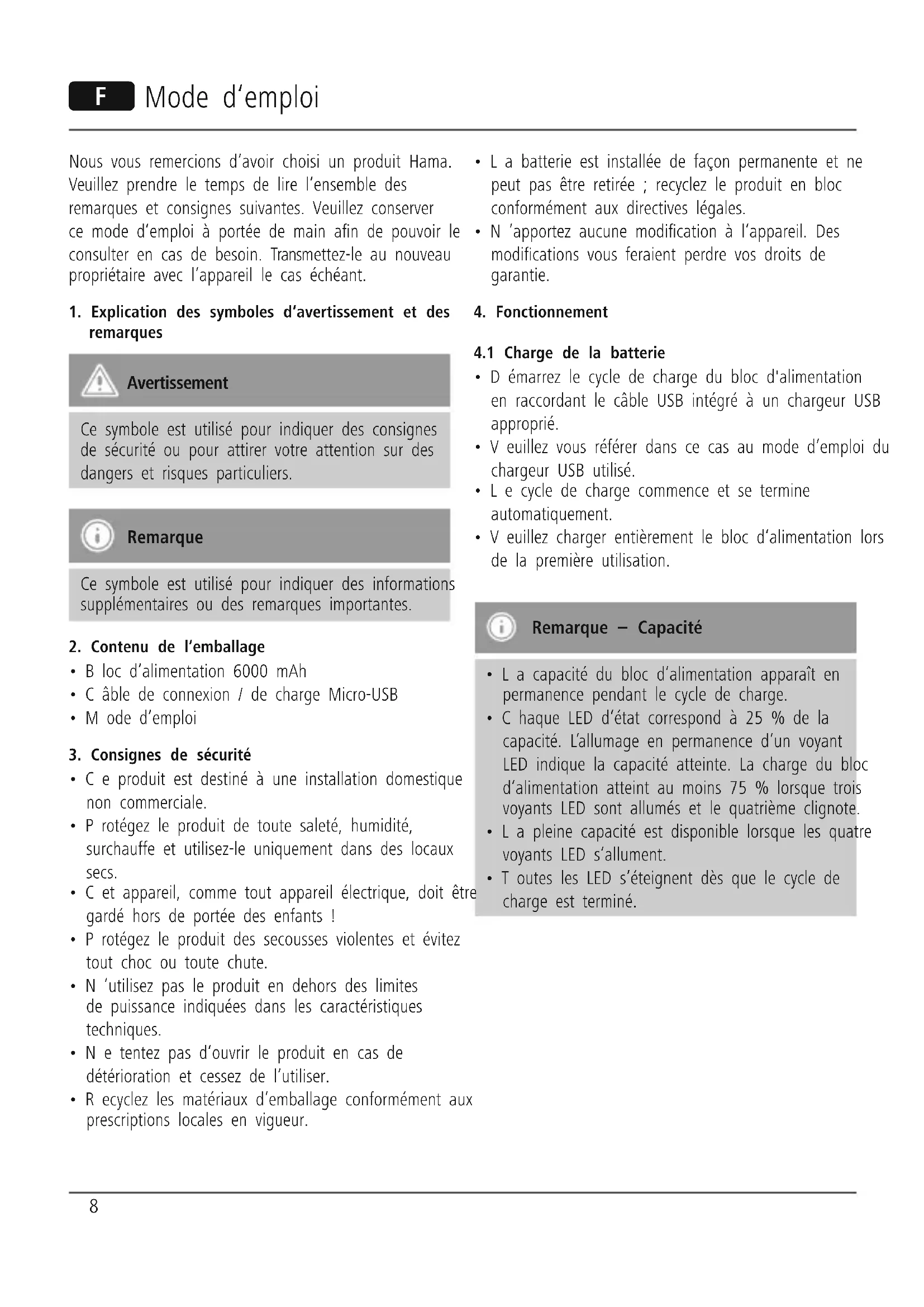 - Veuillez charger entièrement le bloc d‘alimentation lors de la première utilisation. Remarque – Capacité