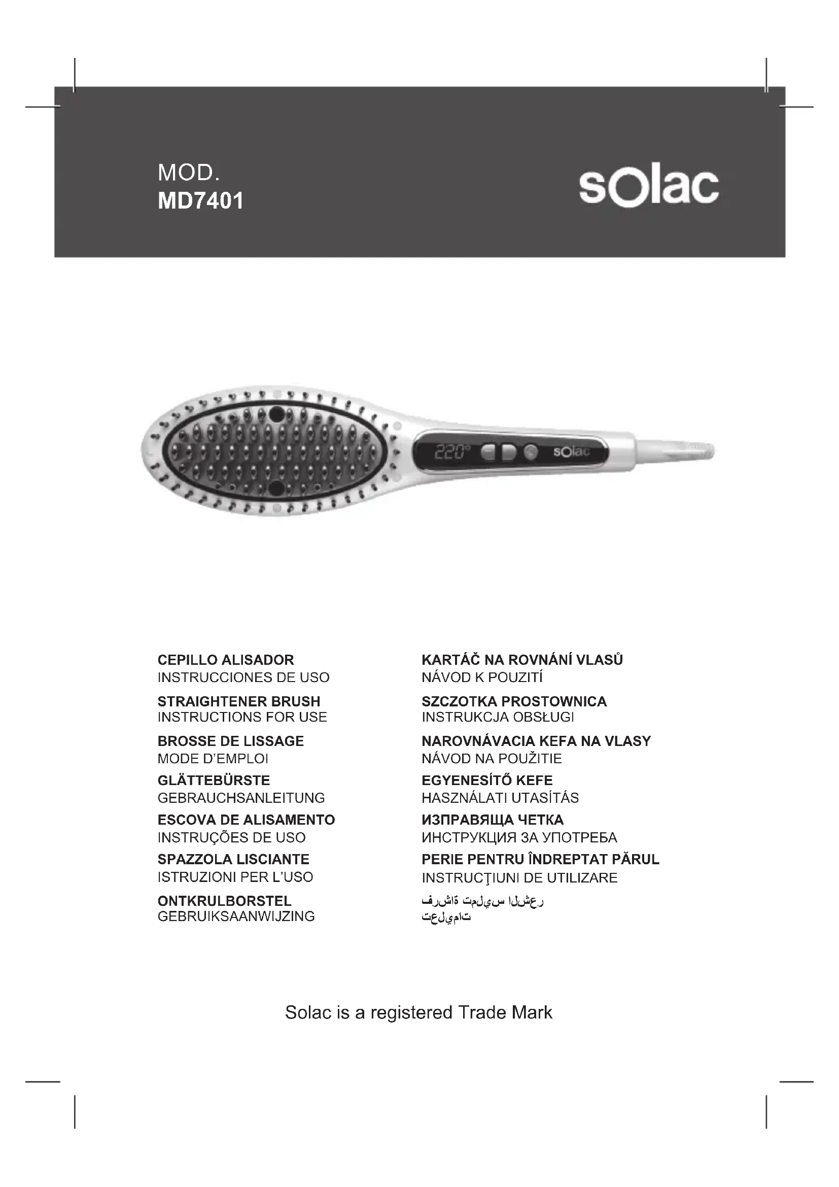 - Les matériaux dont l’emballage de cet appareil est constitué intègrent un programme de collecte, de classication et de recyclage. Si vous souhaitez vous défaire du produit, merci de bien vouloir utiliser les conteneurs publics appropriés à chaque type de matériau. - Le produit ne contient pas de substances concentrées susceptibles d’être considérées comme nuisibles à l’environnement. Ce symbole signie que si vous souhaitez vous débarrasser de l’appareil, en n de vie utile, celui-ci devra être consigné, en prenant les mesures adaptées, à un centre agréé de collecte sélective des déchets d’équipements électriques et électroniques (DEEE). Cet appareil est certié conforme à la directive 2014/35/EU de basse tension, de même qu’à la directive 2014/30/EU en matière de com- patibilité électromagnétique, à la directive 2011/65/EU relative à la limitation de l’utilisation de certaines substances dangereuses dans les équipements électriques et électroniques et à la directive 2009/125/EC sur les conditions de conception écologique applicable aux produits en rapport avec l’énergie.Deutsch Glättebürste MD7401 Sehr geehrte Kundin/Sehr geehrter Kunde, vielen Dank für Ihr Ver- trauen in die Marke SOLAC. Die Technologie, das Design und die Funktionalität dieses Produkts, das die anspruchsvollsten Qualitätsnormen erfüllt, werden Sie über viele Jahre zufriedenstellen. Lesen Sie die Gebrauchsanweisung sorgfältig, bevor Sie das Gerät einschalten und bewahren Sie diese zum Nachschlagen zu einem spä- teren Zeitpunkt auf. Werden die Hinweise dieser Bedienungsanleitung nicht beachtet und eingehalten, kann es zu Unfällen kommen.