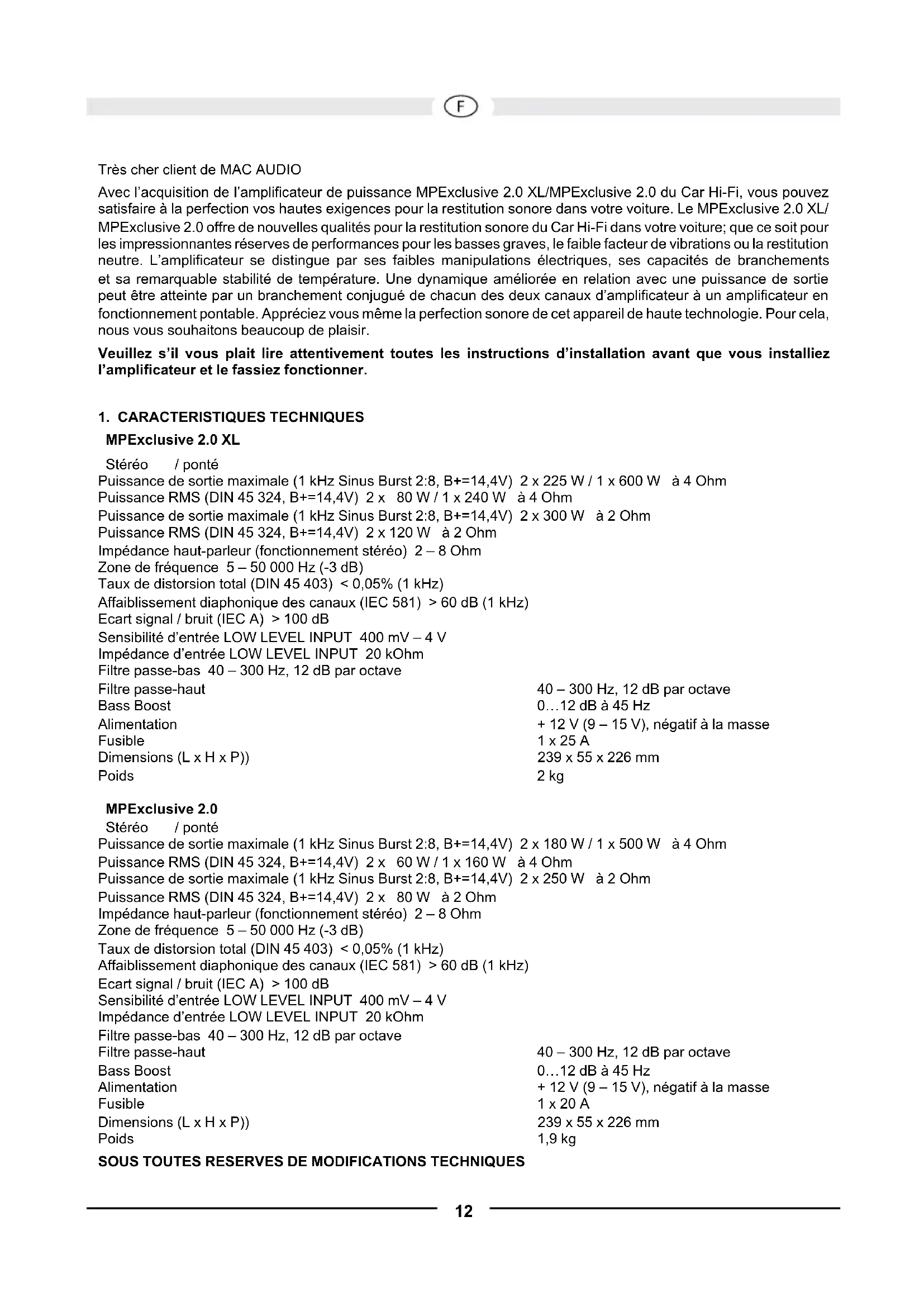 (1) Outputs for connecting additional amplifiers (2) Low-level input (3) Input level control (4) Bass-booster control (5) Cross-over frequency control for the high pass (6) Cross-over frequency control for the low pass (7) (FULL) / LPF (low pass filter) / HPF (high pass filter) option switch (8) Mono-stereo switch12 Très cher client de MAC AUDIO Avec l’acquisition de l’amplificateur de puissance MPExclusive 2.0 XL/MPExclusive 2.0 du Car Hi-Fi, vous pouvez satisfaire à la perfection vos hautes exigences pour la restitution sonore dans votre voiture. Le MPExclusive 2.0 XL/ MPExclusive 2.0 offre de nouvelles qualités pour la restitution sonore du Car Hi-Fi dans votre voiture; que ce soit pour les impressionnantes réserves de performances pour les basses graves, le faible facteur de vibrations ou la restitution neutre. L’amplificateur se distingue par ses faibles manipulations électriques, ses capacités de branchements et sa remarquable stabilité de température. Une dynamique améliorée en relation avec une puissance de sortie peut être atteinte par un branchement conjugué de chacun des deux canaux d’amplificateur à un amplificateur en fonctionnement pontable. Appréciez vous même la perfection sonore de cet appareil de haute technologie. Pour cela, nous vous souhaitons beaucoup de plaisir. Veuillez s’il vous plait lire attentivement toutes les instructions d’installation avant que vous installiez l’amplificateur et le fassiez fonctionner.