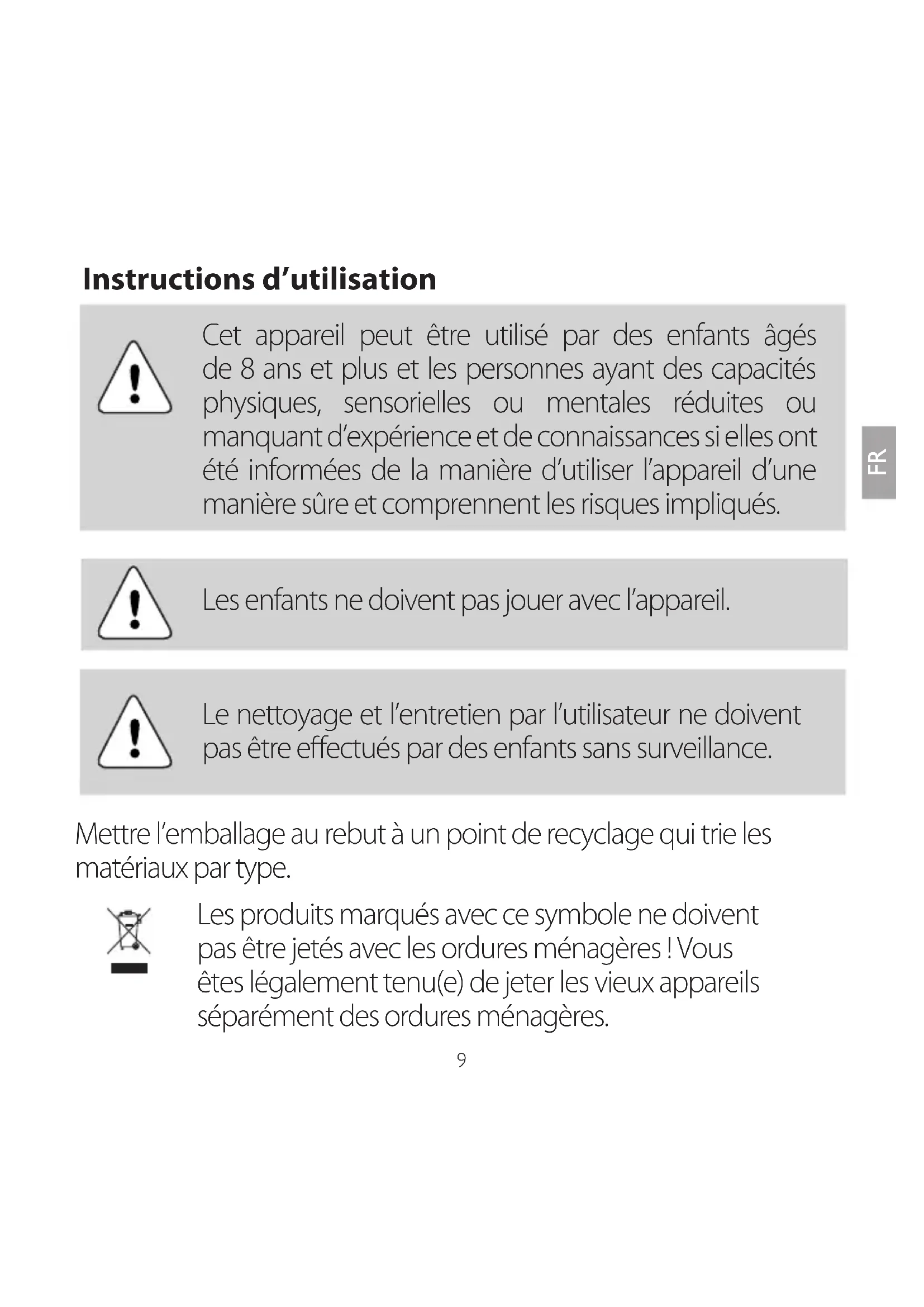 Cet appareil peut être utilisé par des enfants âgés de 8 ans et plus et les personnes ayant des capacités physiques, sensorielles ou mentales réduites ou manquant d'expérience et de connaissances si elles ont été informées de la manière d'utiliser l'appareil d'une manière sûre et comprennent les risques impliqués.