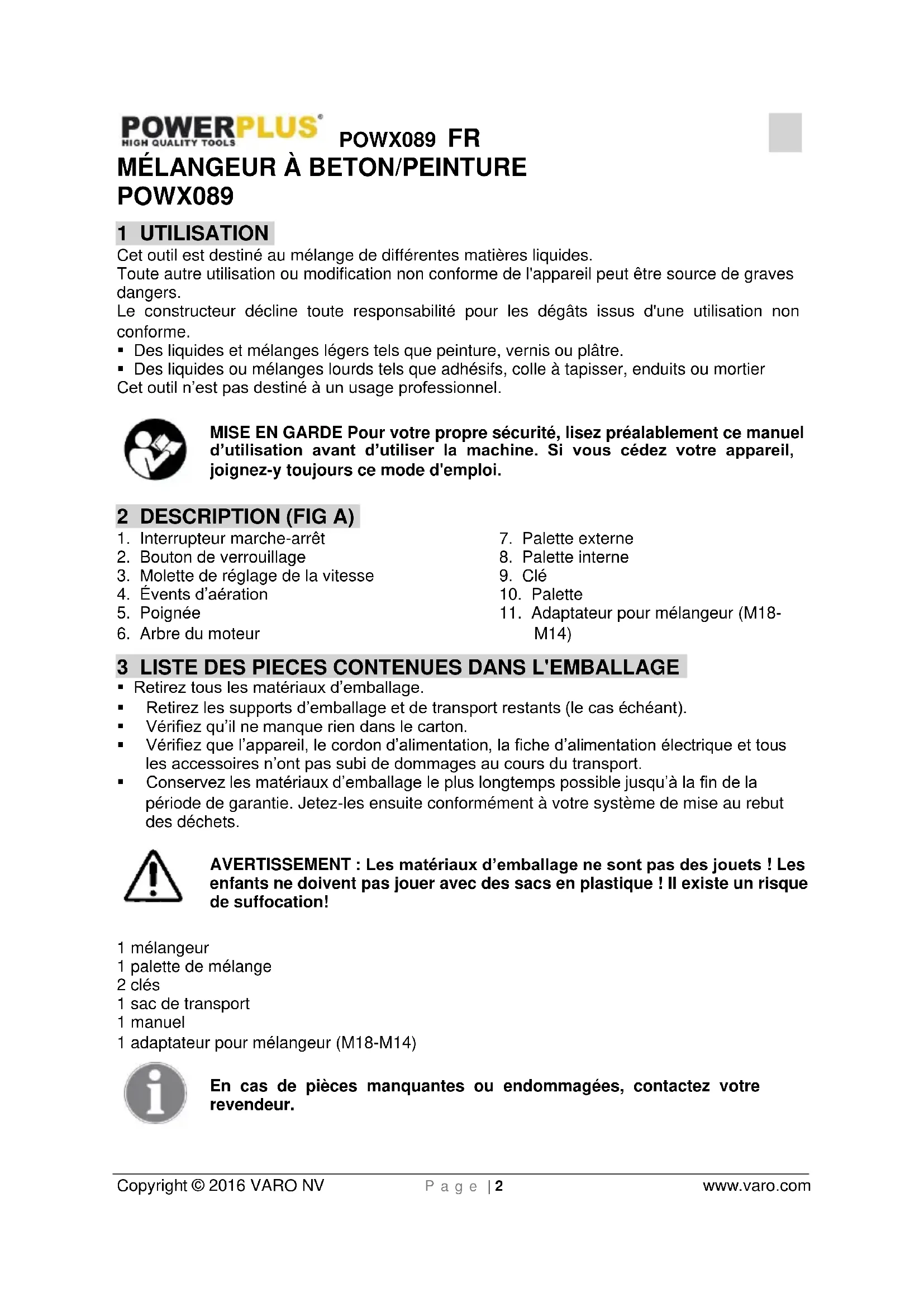 VARO N.V. - Joseph Van Instraat 9 - BE2500 Lier - BELGIQUE, déclare que : appareil : Mélangeur À Beton/Peinture marque : POWERplus modèle : POWX089 est en conformité avec les exigences essentielles et les autres dispositions pertinentes des Directives européennes applicables, basées sur l'application des normes européennes harmonisées. Toute modification non autorisée de l'appareil annule cette déclaration. Directives européennes (y compris, le cas échéant, leurs amendements à la date de la signature) ; 2014/30/EU 2006/42/EC 2011/65/EU Normes européennes harmonisées (y compris, le cas échéant, leurs amendements à la date de la signature) ; EN60745-1 : 2009 EN55014-1 : 2006 EN55014-2 : 1997 EN61000-3-2 : 2014 EN61000-3-3 : 2013 Détenteur de la Documentation technique : Philippe Vankerkhove, VARO – Vic. Van Rompuy N.V. Le soussigné agit au nom du PDG de l'entreprise, Hugo Cuypers Réglementation – Directeur de la conformité Date : 01/12/2016POWX089 EN Copyright © 2017 VARO NV P a g e | 1 www.varo.com 1 APPLICATION ............................................................................. 2