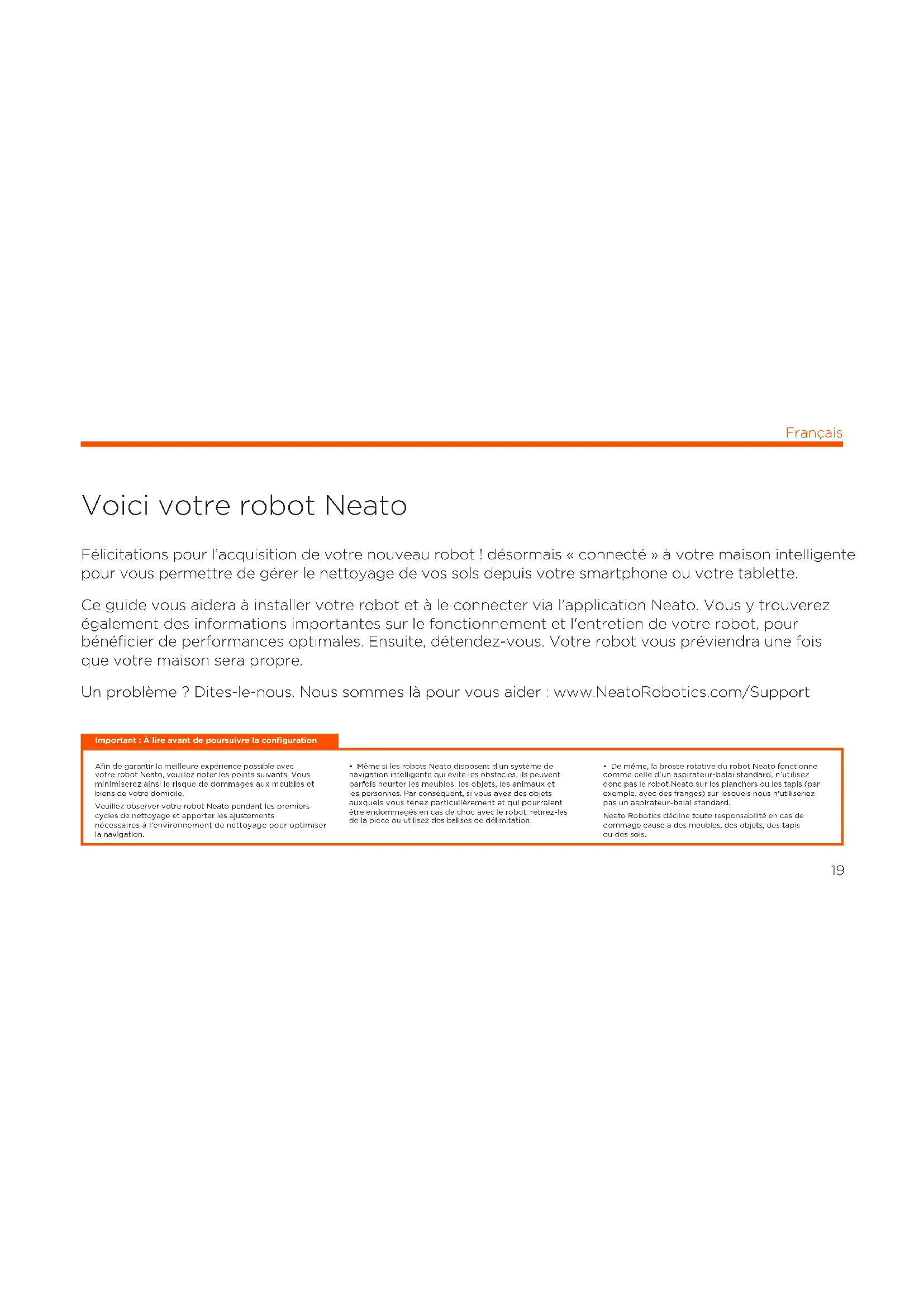 - Même si les robots Neato disposent d'un système de navigation intelligente qui évite les obstacles, ils peuvent parfois heurter les meubles, les objets, les animaux et les personnes. Par conséquent, si vous avez des objets auxquels vous tenez particulièrement et qui pourraient être endommagés en cas de choc avec le robot, retirez-les de la pièce ou utilisez des balises de délimitation. • De même, la brosse rotative du robot Neato fonctionne comme celle d'un aspirateur-balai standard, n'utilisez donc pas le robot Neato sur les planchers ou les tapis (par exemple, avec des franges) sur lesquels nous n'utiliseriez pas un aspirateur-balai standard. Neato Robotics décline toute responsabilité en cas de dommage causé à des meubles, des objets, des tapis oudes sols. Important: À lire avant de poursuivre la configuration Français20 Vue d'ensemble ............................................................................. 21 Points et conseils importants ................................................. 22 Bouton de démarrage et voyants ........................................ 23 Fonctionnement durobot Neato ......................................... 24 Utilisation de l'application Neato ......................................... 25 Neato FloorPlanner avec «lignes de délimitation» .... 27 Utilisation de votre robot sans l'application Neato ..... 28 Entretien de votre robot Neato ............................................. 29 Plus d'informations ...................................................................... 31 Résolution des problèmes (suite) ........................................ 32 Vous et votre robot Neato ....................................................... 36 Table des matières Vous voulez voir comment ça marche? Accédez au site www.NeatoRobotics.com/Support pour regarder des vidéos d’installation et obtenir des conseils.21 Vue d'ensemble