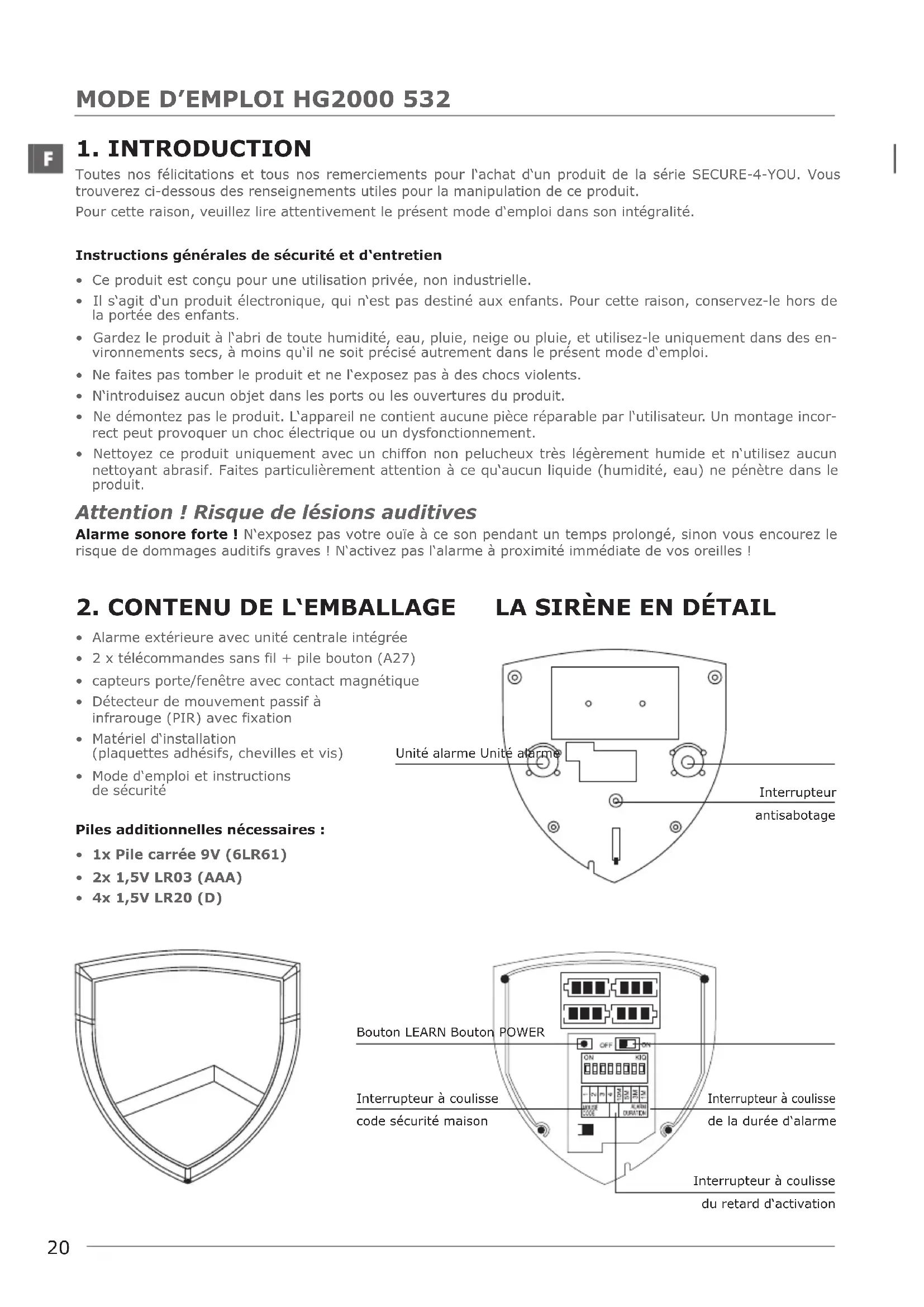 - 4x 1,5V LR20 (D) Unité alarme Unité alarme Interrupteur antisabotage Bouton LEARN Bouton POWER Interrupteur à coulisse de la durée d‘alarme Interrupteur à coulisse code sécurité maison Interrupteur à coulisse du retard d‘activation21