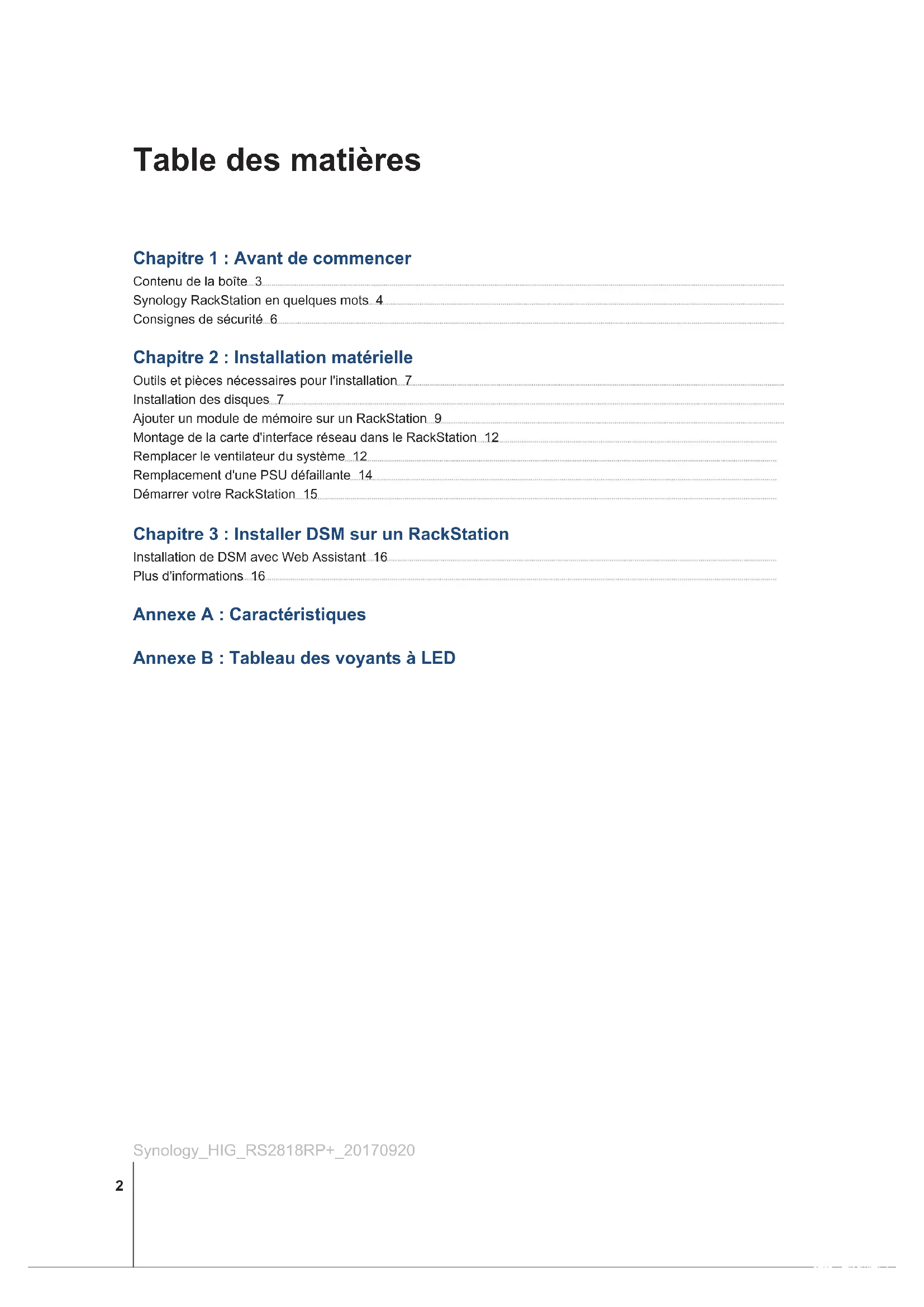 Installation de DSM avec Web Assistant 16 Plus d'informations 16 Annexe A : Caractéristiques Annexe B : Tableau des voyants à LED Synology_HIG_RS2818RP+_20170920 2Nous vous remercions d'avoir acheté un produit Synology. Avant d'installer votre nouveau RackStation, veuillez vérier le contenu du colis an de vous assurer que vous avez reçu les éléments ci-dessous. Veillez également à lire attentivement les instructions de sécurité pour éviter de vous blesser ou d'endommager votre RackStation. Remarque : toutes les images ci-dessous sont fournies uniquement à titre d'illustration et peuvent être diérentes du produit réel. Contenu de la boîte Unité principale x 1 Cordon d'alimentation secteur x 268 vis de xation pour disques durs 2.5"68 vis de xation pour disques durs 3.5" Avant de commencer