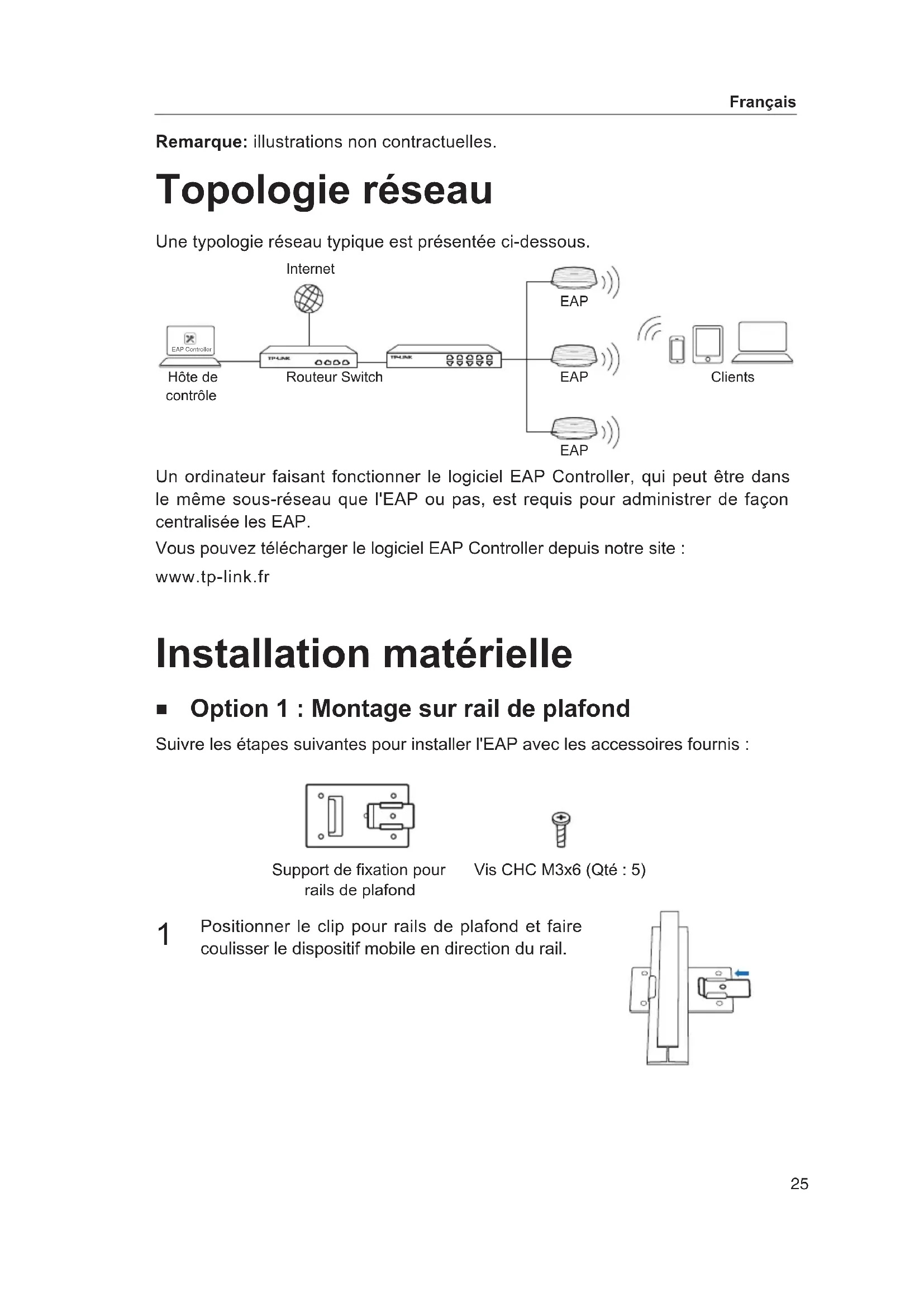 Positionner le clip pour rails de plafond et faire coulisser le dispositif mobile en direction du rail. Hôte de contrôleRouteur SwitchClients Support de xation pour rails de plafond Vis CHC M3x6 (Qté : 5) Internet EAP EAP EAP26 Français