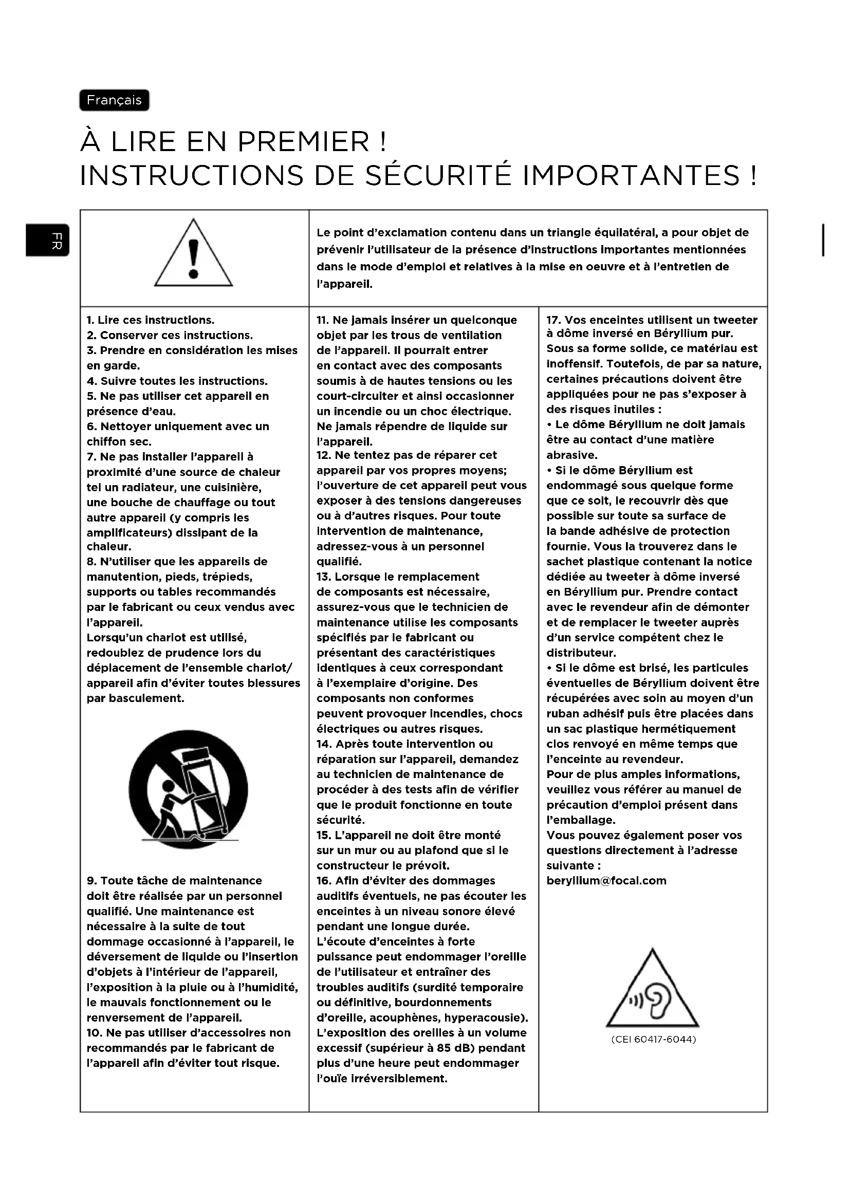 - Si le dôme est brisé, les particules éventuelles de Béryllium doivent être récupérées avec soin au moyen d’un ruban adhésif puis être placées dans un sac plastique hermétiquement clos renvoyé en même temps que l’enceinte au revendeur. Pour de plus amples informations, veuillez vous référer au manuel de précaution d’emploi présent dans l’emballage. Vous pouvez également poser vos questions directement à l’adresse suivante : beryllium@focal.com (CEI 60417-6044)9 SOPRA