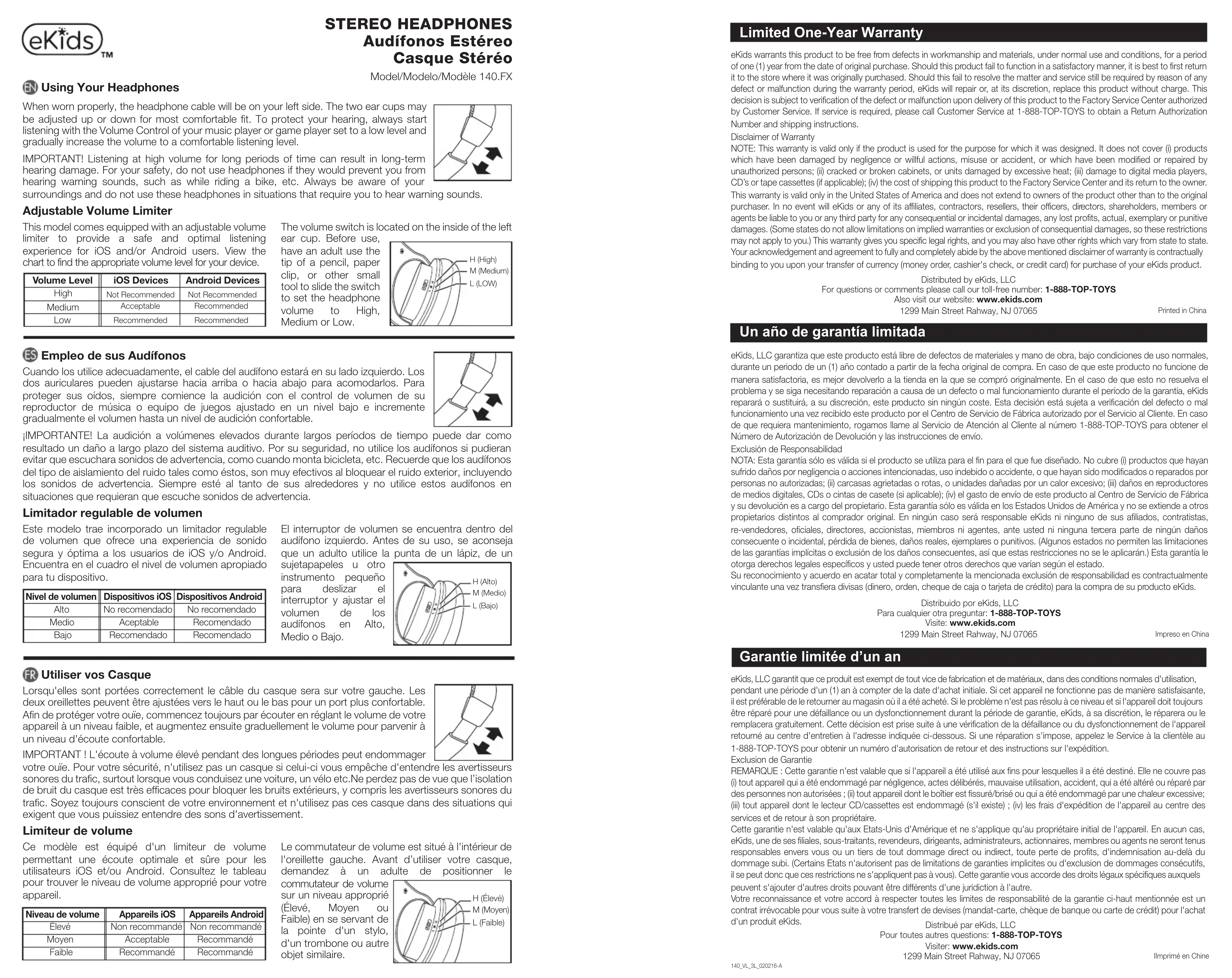 eKids, LLC garant que op produit est exempôt de toutvice de fabrication et de matérielles, dans des conditions normales d'utilisation, pendant une période d'un (1) an à compter de la date d'achat initiale. Si ceapanell ne fonctionne pas de manière satisfaitante, it est préférentie de le revoir au magasin ou ià été acheté. Si le problème n'est pas résolu à ce niveau et si l'panelel doit tousiers répérapper pour une défaillance ou un dysfunctionnement durant la période de garantie, eKids, à sa désciption, le répêrance ou le replacneraientuement. Cette décision est prise suite à une verification de la défaillance ou du dysfunctionnement de l'panelel revoir au centre d'entretien à l'adresse indiquée ci-dessus. Si une réparation s'impose, appellez le Service à la société au 1-888-TOP-TOYS pour Obtien un numéro d'autorisation de retour et des instructions sur l'expedition.
