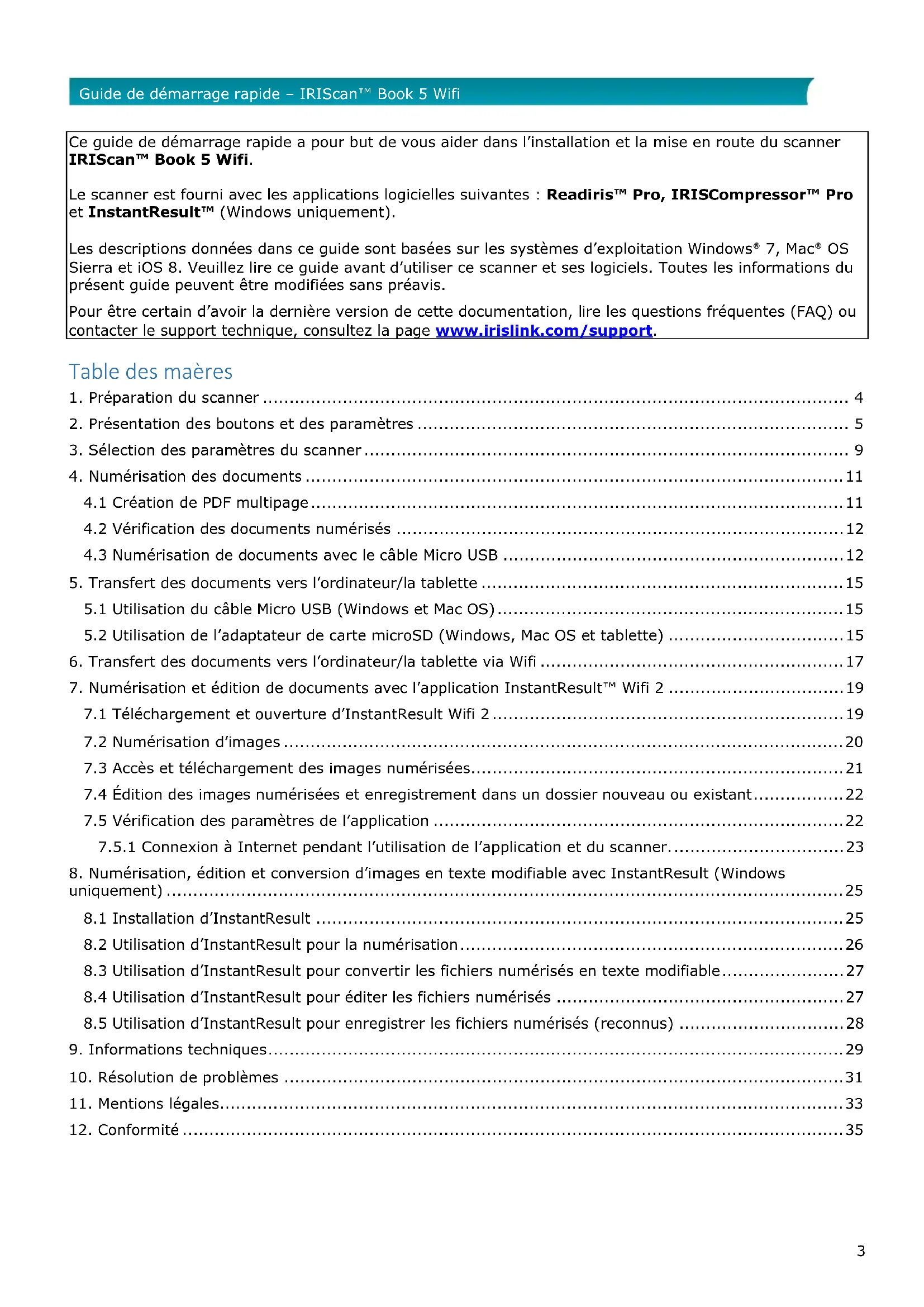 Ce guide de démarrage rapide a pour but de vous aider dans l'installation et la mise en route du scanner IRIScan™ Book 5 Wifi.