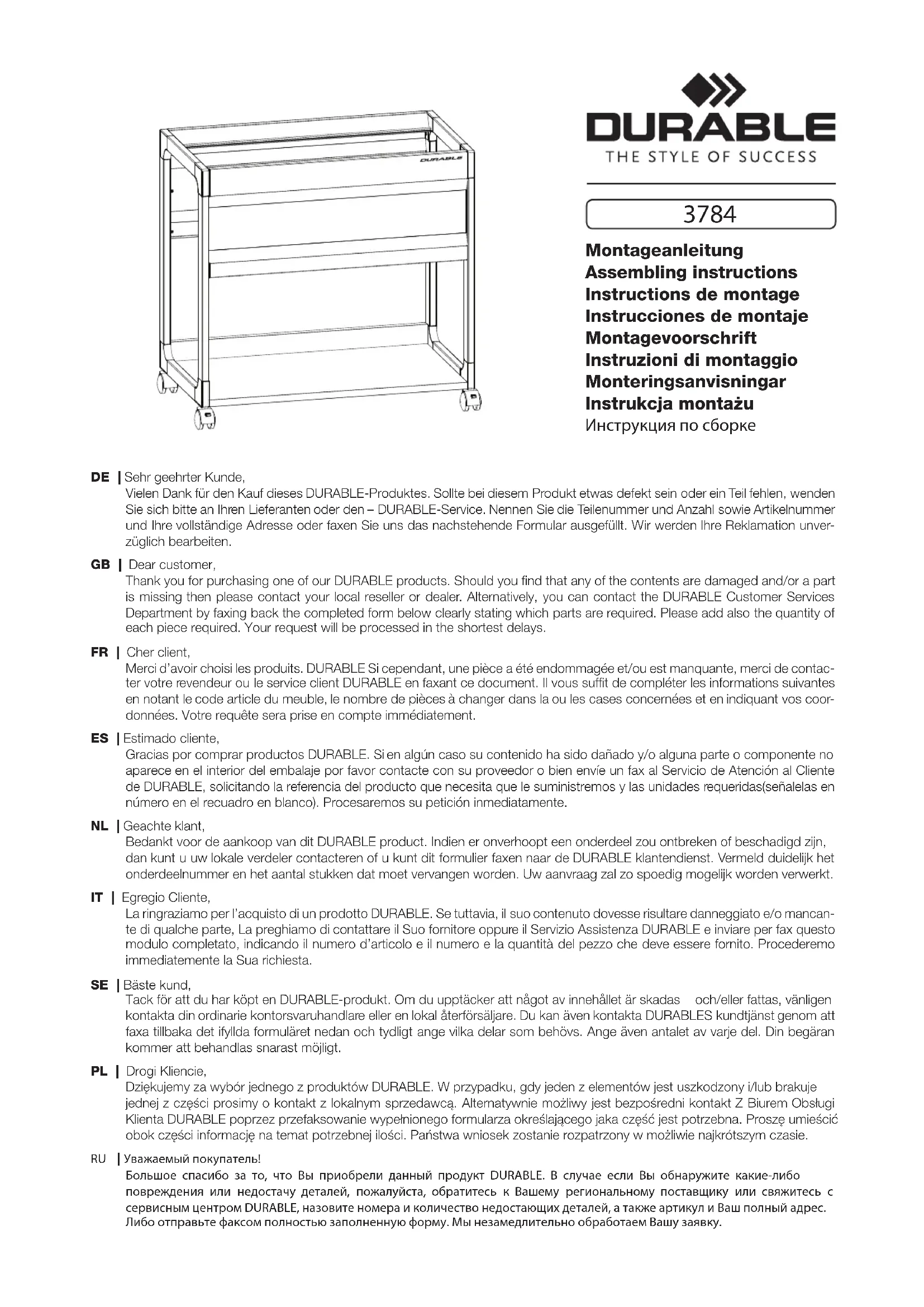 Merci d'avoir choisi les produits. DURABLE Si cependant, une piece a ete endomagee et/ou est manquante, merci de contacter voire revendeur ou le service client DURABLE en faxant ce document. Il you suftit de completer les informations suivantes en notant le code article du meuble, le nombre de pieces a changer dans la ou les cases concernees et en indiquant vos coordonnées. Voitre requete sera prise en compte immediatement.