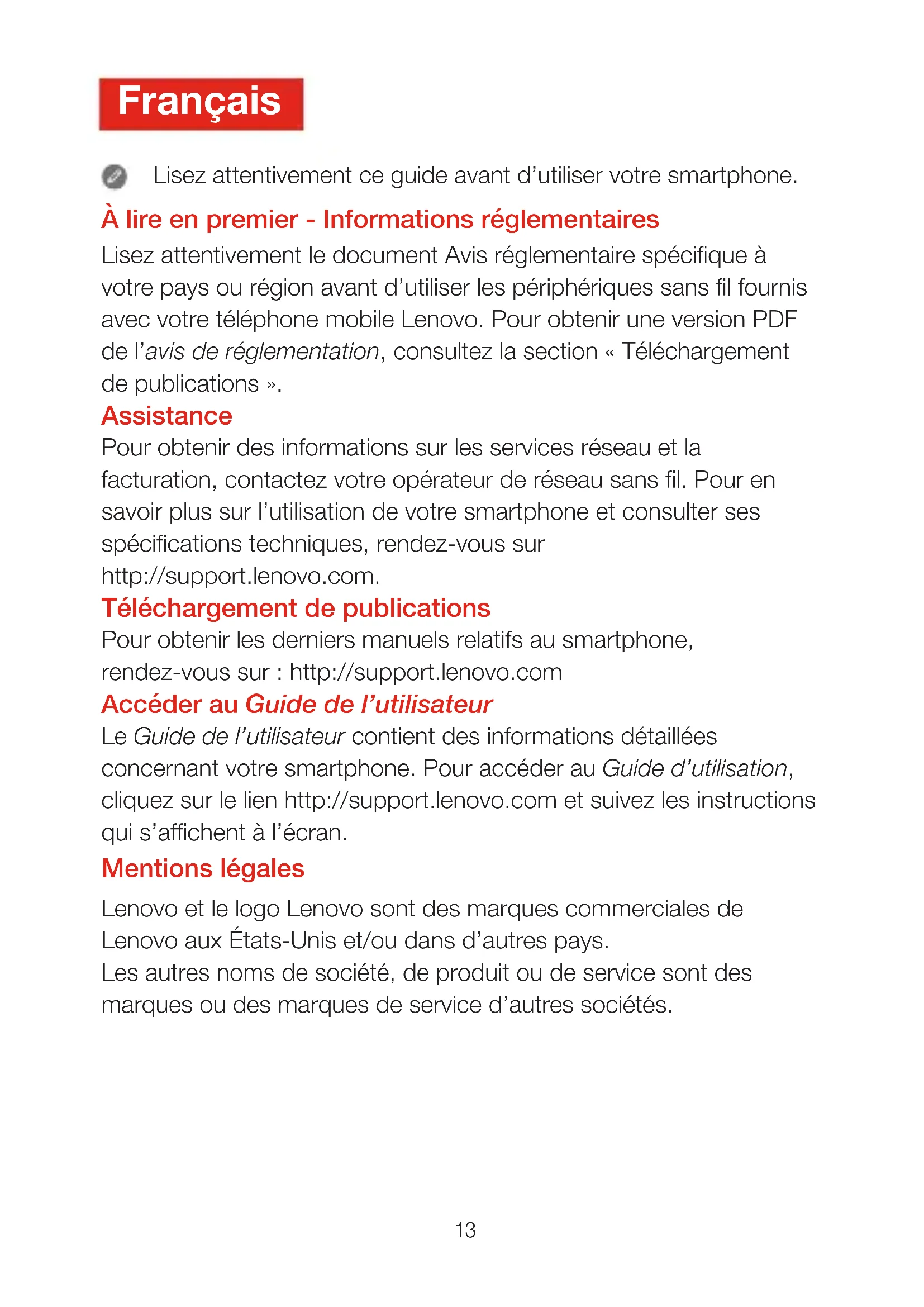 Mentions légales Lenovo et le logo Lenovo sont des marques commerciales de Lenovo aux États-Unis et/ou dans d’autres pays. Les autres noms de société, de produit ou de service sont des marques ou des marques de service d’autres sociétés. À lire en premier - Informations réglementaires Lisez attentivement le document Avis réglementaire spécifique à votre pays ou région avant d’utiliser les périphériques sans fil fournis avec votre téléphone mobile Lenovo. Pour obtenir une version PDF de l’avis de réglementation, consultez la section «Téléchargement de publications». Assistance Pour obtenir des informations sur les services réseau et la facturation, contactez votre opérateur de réseau sans fil. Pour en savoir plus sur l’utilisation de votre smartphone et consulter ses spécifications techniques, rendez-vous sur http://support.lenovo.com. Téléchargement de publications Pour obtenir les derniers manuels relatifs au smartphone, rendez-vous sur : http://support.lenovo.com Accéder au Guide de l’utilisateur Le Guide de l’utilisateur contient des informations détaillées concernant votre smartphone. Pour accéder au Guide d’utilisation, cliquez sur le lien http://support.lenovo.com et suivez les instructions qui s’affichent à l’écran. Lisez attentivement ce guide avant d’utiliser votre smartphone. Français14 Présentation Indicateur