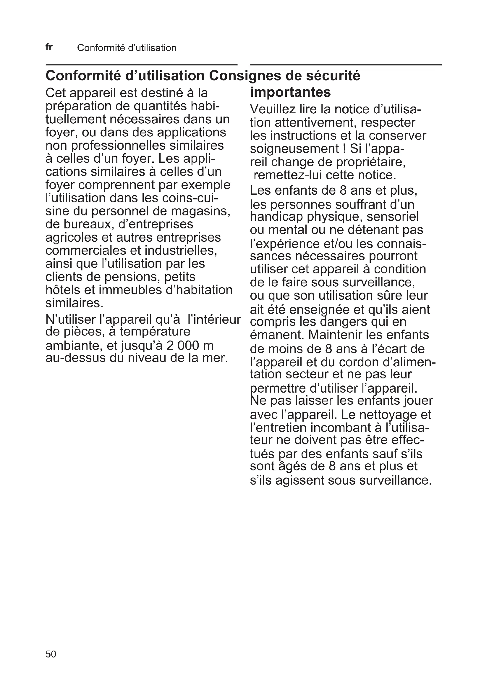 Conformité dʼutilisation Cet appareil est destiné à la préparation de quantités habi- tuellement nécessaires dans un foyer, ou dans des applications non professionnelles similaires à celles dʼun foyer. Les appli- cations similaires à celles dʼun foyer comprennent par exemple lʼutilisation dans les coins-cui- sine du personnel de magasins, de bureaux, dʼentreprises agricoles et autres entreprises commerciales et industrielles, ainsi que lʼutilisation par les clients de pensions, petits hôtels et immeubles dʼhabitation similaires. Nʼutiliser lʼappareil quʼà lʼintérieur de pièces, à température ambiante, et jusquʼà 2 000 m au-dessus du niveau de la mer. Consignes de sécurité importantes Veuillez lire la notice dʼutilisa- tion attentivement, respecter les instructions et la conserver soigneusement ! Si lʼappa- reil change de propriétaire, remettez-lui cette notice. Les enfants de 8 ans et plus, les personnes souffrant dʼun handicap physique, sensoriel ou mental ou ne détenant pas lʼexpérience et/ou les connais- sances nécessaires pourront utiliser cet appareil à condition de le faire sous surveillance, ou que son utilisation sûre leur ait été enseignée et quʼils aient compris les dangers qui en émanent. Maintenir les enfants de moins de 8 ans à lʼécart de lʼappareil et du cordon dʼalimen- tation secteur et ne pas leur permettre dʼutiliser lʼappareil. Ne pas laisser les enfants jouer avec lʼappareil. Le nettoyage et lʼentretien incombant à lʼutilisa- teur ne doivent pas être effec- tués par des enfants sauf sʼils sont âgés de 8 ans et plus et sʼils agissent sous surveillance. Conformité d’utilisation Conformité d’utilisation Consignes de sécurité importantes51
