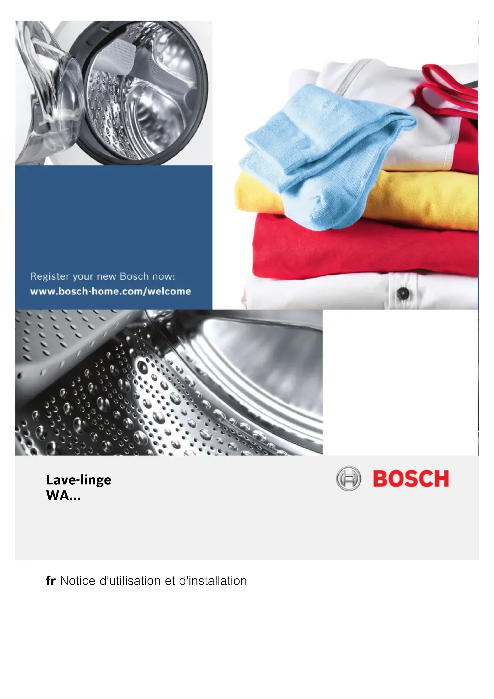 fr Notice d'utilisation et d'installation Lave-linge WA...2 Votre nouveau lave-linge Vous avez opté pour un lave-linge de marque Bosch. Prenez quelques minutes pour consulter cette documentation et découvrir les avantages de votre lave-linge. Conformément à la politique de qualité de la marque Bosch, nous soumettons chaque lave-linge qui quitte notre usine à des contrôles minutieux afin de garantir son bon état et son bon fonctionnement. Pour plus d'informations sur nos produits, nos accessoires, nos pièces de rechange et nos services, consultez notre site Internet www.bosch- home.com ou adressez-vous à nos centres de service après-vente. Si la notice d'installation et d'utilisation porte sur différents modèles, les différences sont indiquées là où cela est nécessaire. Ne mettez le lave-linge en service qu'après avoir lu cette notice d'installation et d'utilisation ! Règles de présentation : Avertissement ! L'association de ce symbole et de ce mot indique une situation potentiellement dangereuse. En cas de non-observation, risques de blessures voire de mort. Attention ! Ce mot indique une situation potentiellement dangereuse. En cas de non-observation, risques de dégâts matériels et/ou d'atteinte à l'environnement. Remarque/astuce Indications permettant d'utiliser l'appareil au mieux et autres informations utiles.