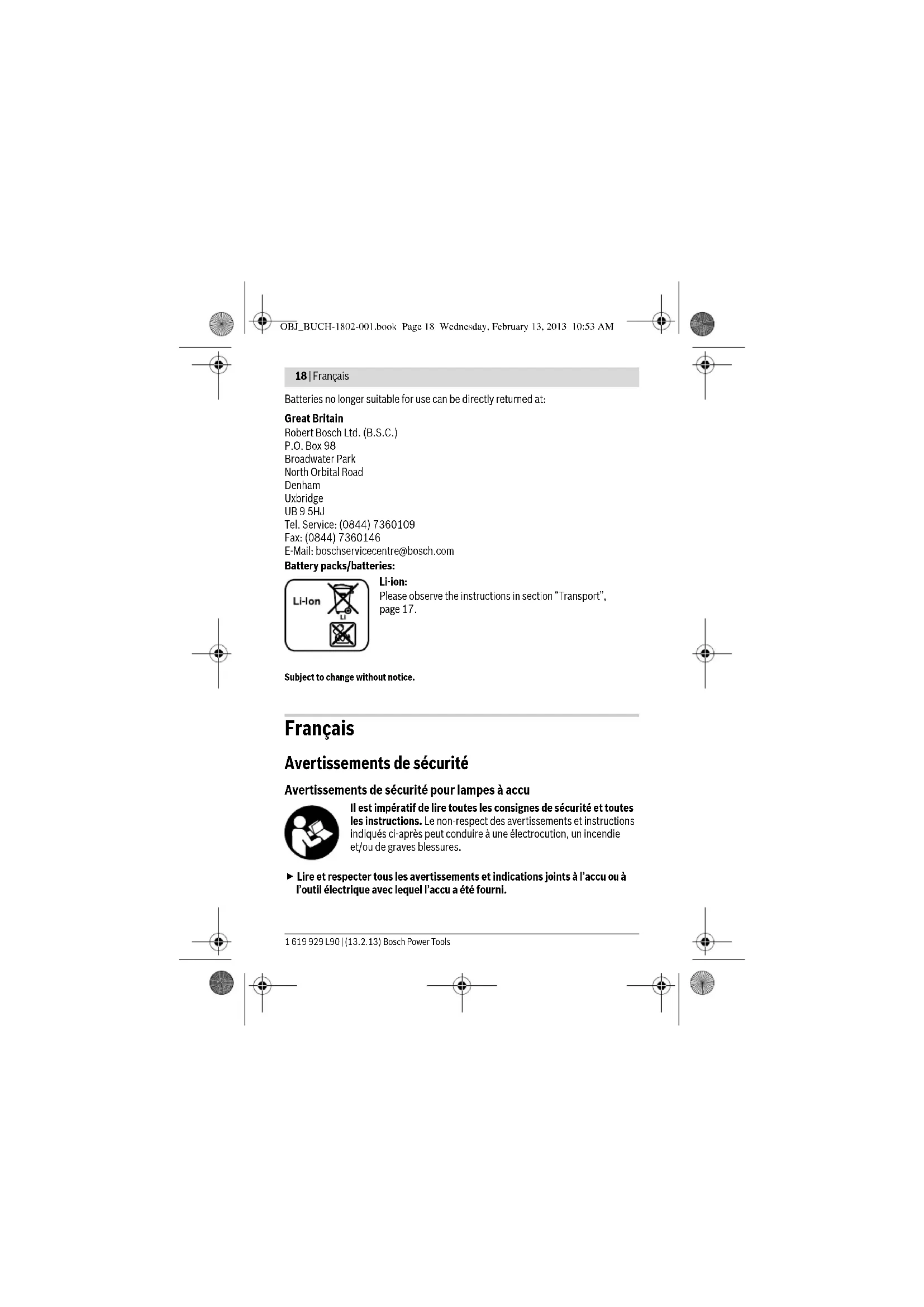 Operating temperature °C – 10 ... +40 Storage temperature °C – 15 ... +50 Weight according to EPTA-Procedure 01/2003 kg 0,3 OBJ_BUCH-1802-001.book Page 13 Wednesday, February 13, 2013 10:53 AM14 | English 1 619 929 L90 | (13.2.13) Bosch Power Tools The Lithium-Ion battery can be charged at any time without reducing its service life. Interrupting the charging procedure does not damage the battery. The lithium ion battery is protected against deep discharging by the “Electronic Cell Protection (ECP)”. When the battery is empty, the cordless worklight is switched off by means of a protective circuit. Do not continue to press the On/Off switch after the cordless worklight has been automatically switched off. The battery can be damaged. To remove the battery 3, press the battery unlocking button 4 and pull the battery out of the cordless worklight toward the rear. Do not exert any force. The battery is equipped with a NTC temperature control which allows charging only within a temperature range of between 0 °C and 45 °C. A long battery service life is achieved in this manner. Observe the notes for disposal. Operation Starting Operation Inserting the battery Use only original Bosch lithium ion batteries with the voltage listed on the nameplate of your cordless worklight. Using other batteries can lead to injuries and pose a fire hazard. Insert the charged battery 3 into the handle until it can be felt to engage and faces flush against the handle. Switching On and Off The cordless worklight produces a light beam that emerges from the lamp head 1. To start the cordless worklight, press the On/Off switch 2. To switch off the cordless worklight, press the On/Off switch 2 again. To save energy, only switch the cordless worklight on when using it. Maintenance and Service Maintenance and Cleaning When the battery is no longer operative, please refer to an authorised after-sales ser- vice agent for Bosch power tools. OBJ_BUCH-1802-001.book Page 14 Wednesday, February 13, 2013 10:53 AMEnglish | 15 Bosch Power Tools 1 619 929 L90 | (13.2.13) The cordless worklight is maintenance-free and and contains no components that must be replaced or maintained. To avoid damage, clean the plastic lens of the cordless worklight only with a dry, soft cloth. Do not use cleaning agents or solvent. If the cordless worklight should fail despite the care taken in manufacturing and test- ing procedures, repair should be carried out by an authorized after-sales service agent for Bosch power tools. In all correspondence and spare parts orders, please always include the 10-digit arti- cle number given on the nameplate of the cordless worklight. After-sales Service and Application Service Our after-sales service responds to your questions concerning maintenance and re- pair of your product as well as spare parts. Exploded views and information on spare parts can also be found under: www.bosch-pt.com Bosch’s application service team will gladly answer questions concerning our prod- ucts and their accessories. Great Britain Robert Bosch Ltd. (B.S.C.) P.O. Box 98 Broadwater Park North Orbital Road Denham Uxbridge UB 9 5HJ Tel. Service: (0844) 7360109 Fax: (0844) 7360146 E-Mail: boschservicecentre@bosch.com Ireland Origo Ltd. Unit 23 Magna Drive Magna Business Park City West Dublin 24 Tel. Service: (01) 4666700 Fax: (01) 4666888 OBJ_BUCH-1802-001.book Page 15 Wednesday, February 13, 2013 10:53 AM16 | English 1 619 929 L90 | (13.2.13) Bosch Power Tools Australia, New Zealand and Pacific Islands Robert Bosch Australia Pty. Ltd. Power Tools Locked Bag 66 Clayton South VIC 3169 Customer Contact Center Inside Australia: Phone: (01300) 307044 Fax: (01300) 307045 Inside New Zealand: Phone: (0800) 543353 Fax: (0800) 428570 Outside AU and NZ: Phone: +61 3 95415555 www.bosch.com.au Republic of South Africa Customer service Hotline: (011) 6519600 Gauteng – BSC Service Centre 35 Roper Street, New Centre Johannesburg Tel.: (011) 4939375 Fax: (011) 4930126 E-Mail: bsctools@icon.co.za KZN – BSC Service Centre Unit E, Almar Centre 143 Crompton Street Pinetown Tel.: (031) 7012120 Fax: (031) 7012446 E-Mail: bsc.dur@za.bosch.com Western Cape – BSC Service Centre Democracy Way, Prosperity Park Milnerton Tel.: (021) 5512577 Fax: (021) 5513223 E-Mail: bsc@zsd.co.za OBJ_BUCH-1802-001.book Page 16 Wednesday, February 13, 2013 10:53 AMEnglish | 17 Bosch Power Tools 1 619 929 L90 | (13.2.13) Bosch Headquarters Midrand, Gauteng Tel.: (011) 6519600 Fax: (011) 6519880 E-Mail: rbsa-hq.pts@za.bosch.com Transport The contained lithium-ion batteries are subject to the Dangerous Goods Legislation requirements. The user can transport the batteries by road without further require- ments. When being transported by third parties (e.g.: air transport or forwarding agency), special requirements on packaging and labelling must be observed. For preparation of the item being shipped, consulting an expert for hazardous material is required. Dispatch batteries only when the housing is undamaged. Tape or mask off open con- tacts and pack up the battery in such a manner that it cannot move around in the pack- aging. Please also observe possibly more detailed national regulations. Disposal Cordless worklights, accessories and packaging should be sorted for environ- mental-friendly recycling. Do not dispose of cordless worklights into household waste! Only for EC countries: According to the European Guideline 2012/19/EU for Waste Elec- trical and Electronic Equipment, cordless worklights that are no longer usable, and according to the European Guideline 2006/66/EC, defective or used battery packs/batteries, must be collected separately and disposed of in an environmentally correct manner. OBJ_BUCH-1802-001.book Page 17 Wednesday, February 13, 2013 10:53 AM18 | Français 1 619 929 L90 | (13.2.13) Bosch Power Tools Batteries no longer suitable for use can be directly returned at: Great Britain Robert Bosch Ltd. (B.S.C.) P.O. Box 98 Broadwater Park North Orbital