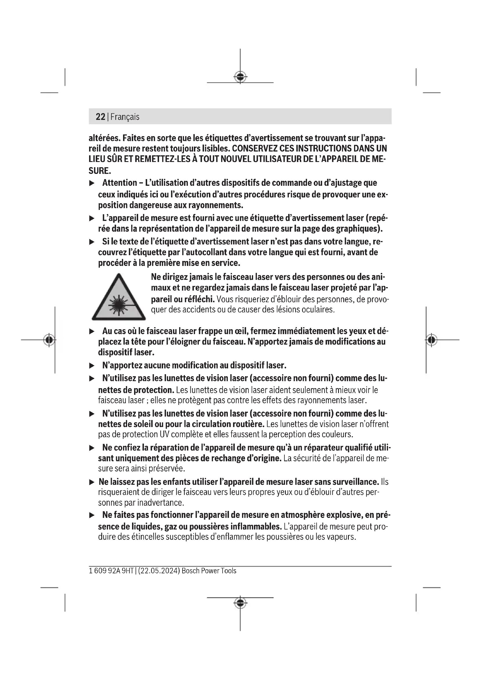 à 20–25°C C) Les valeurs indiquées s’appliquent dans des conditions ambiantes normales à favorables (par ex. pas de vibrations, pas de brouillard, pas de fumée, pas d’ensoleillement direct). Après de fortes variations de températures, la précision peut différer de la valeur indiquée. D) N’est conçu que pour les salissures/saletés non conductrices mais supporte occasionnellement la conductivité due aux phénomènes de condensation. E) Poids sans piles jetables/rechargeables Pour une identification précise de votre appareil de réception, servez-vous du numéro de série (10) inscrit sur la plaque signalétique. Montage Mise en place/remplacement des piles Pour le fonctionnement de l’appareil de mesure, nous recommandons d’utiliser des piles alcalines au manganèse ou des accus. Pour ouvrir le couvercle du compartiment à piles(8), appuyez sur le verrouillage(7) et retirez le couvercle. Insérez les piles. Respectez ce faisant la polarité indiquée sur le graphique qui se trouve à l’intérieur du compartiment à piles. Lorsque les piles sont vides, la LED d’état(3) s’allume en rouge et les faisceaux laser sont désactivés. Éteignez l’appareil de mesure et changez les piles. Remplacez toujours toutes les piles en même temps. N’utilisez que des piles de la même marque avec la même capacité. u Sortez les piles de l’appareil de mesure si vous savez que l’appareil de mesure ne va pas être utilisé pendant une période prolongée. En cas de stockage prolongé, les piles peuvent se corroder dans l’appareil de mesure. Utilisation Mise en marche u Protégez l’appareil de mesure contre l’humidité, ne l’exposez pas directement aux rayons du soleil. Bosch Power Tools 1 609 92A 9HT | (22.05.2024)26 | Français u N’exposez pas l’appareil de mesure à des températures extrêmes ou de brusques variations de température. Ne le laissez p. ex. pas trop longtemps dans une voiture exposée au soleil. Après un brusque changement de température, attendez que l’ap- pareil de mesure prenne la température ambiante avant de l’utiliser. Des tempéra- tures extrêmes ou de brusques changements de température peuvent réduire la pré- cision de l’appareil de mesure. u Évitez les chocs violents et évitez de faire tomber l’appareil de mesure. L’appareil de mesure risque alors de subir des dommages susceptibles altérer la précision de mesure. Après un choc ou une chute, comparez, pour les contrôler, les lignes laser avec une ligne de référence connue verticale ou horizontale. u Éteignez l’appareil de mesure quand vous le transportez. A l’arrêt de l’appareil, l’unité pendulaire se verrouille afin de prévenir tout endommagement consécutif à des mouvements violents. Mise en marche/arrêt Pour mettre en marche l’appareil de mesure, placez l’interrupteur Marche/Arrêt (5) dans la position ON. Immédiatement après avoir été mis en marche, l’appareil de mesure projette des lignes laser à travers l’orifice de sortie avant(1). u Ne dirigez pas le faisceau laser vers des personnes ou des animaux et ne regar- dez jamais dans le faisceau laser, même si vous êtes à grande distance de ce der- nier. Pour arrêter l’appareil de mesure, placez l’interrupteur Marche/Arrêt (5) dans la posi- tion OFF. Lorsque l’appareil est éteint, l’unité pendulaire se verrouille. u Ne laissez pas l’appareil de mesure sans surveillance quand il est allumé et étei- gnez-le après l’utilisation. D’autres personnes pourraient être éblouies par le fais- ceau laser. Modes de fonctionnement L’appareil de mesure dispose de plusieurs modes de fonctionnement entre lesquels il est possible de commuter à tout moment: – Mode lignes croisées (voir figuresA−B): l’appareil projette une ligne laser horizontale et une ligne laser verticale – Mode lignes croisées et points d’aplomb (voir figureC): l’appareil projette une ligne laser horizontale, une ligne laser verticale et deux points d’aplomb : un vers le haut et un vers le bas – Mode points d’aplomb : l’appareil projette un point d’aplomb vers le haut et un point d’aplomb vers le bas. 1 609 92A 9HT | (22.05.2024) Bosch Power ToolsFrançais | 27 Après sa mise en marche, l’appareil de mesure se trouve dans le mode Lignes croisées avec nivellement automatique. Pour changer de mode de fonctionnement, appuyez sur la touche Mode de fonctionne- ment laser(4) jusqu’à obtenir les lignes laser du mode de fonctionnement souhaité. Il est possible – dans tous les modes de fonctionnement – d’activer ou non le nivellement automatique et la fonction d’inclinaison. Nivellement automatique Utilisation avec nivellement automatique (voirfiguresAetC) Lors d’une utilisation avec nivellement automatique, la LED d’état(3) ne doit pas s’allu- mer. Réactivez si nécessaire le nivellement automatique en actionnant la touche Fonc- tion d’inclinaison(2), de façon à ce que la LED d’état s’éteigne. Placez l’appareil de mesure sur un support horizontal stable ou montez-le sur le trépied(11). Le nivellement automatique compense automatiquement l’inclinaison de l’appareil à l’in- térieur de la plage d’auto-nivellement de ±4°. Le nivellement automatique est terminé dès que les lignes laser ne bougent plus. Quand un nivellement automatique n’est pas possible, par ex. du fait que la surface sur laquelle est posé l’appareil de mesure est inclinée de plus de 4° par rapport à l’horizon- tale, les lignes laser se mettent à clignoter. En pareil cas, placez l’appareil de mesure plus à l’horizontale et attendez que le nivelle- ment automatique se fasse. Dès que l’appareil de mesure se trouve à l’intérieur de la plage d’auto-nivellement de ±4°, les lignes laser cessent de clignoter et restent allumées en permanence. En dehors de la plage d’auto-nivellement de ±4°, il n’est pas possible d’utiliser l’appareil de mesur