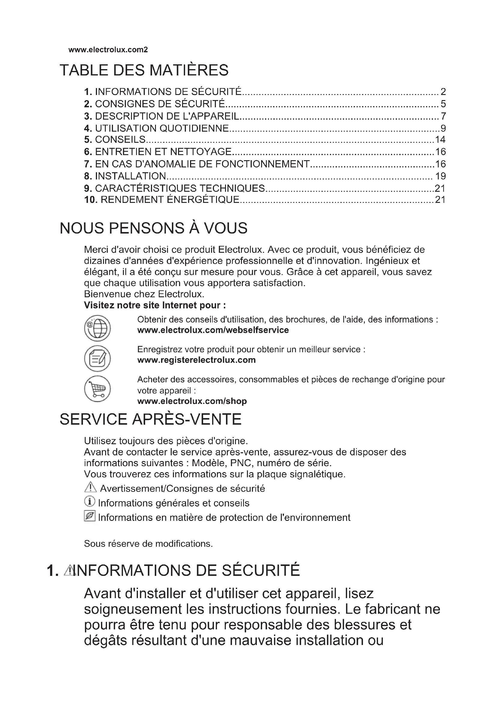 Merci d'avoir choisi ce produit Electrolux. Avec ce produit, vous bénéficiez de dizaines d'années d'expérience professionnelle et d'innovation. Ingénieux et élégant, il a été conçu sur mesure pour vous. Grâce à cet appareil, vous savez que chaque utilisation vous apportera satisfaction. Bienvenue chez Electrolux. Visitez notre site Internet pour : Obtenir des conseils d'utilisation, des brochures, de l'aide, des informations : www.electrolux.com/webselfservice Enregistrez votre produit pour obtenir un meilleur service : www.registerelectrolux.com Acheter des accessoires, consommables et pièces de rechange d'origine pour votre appareil : www.electrolux.com/shop