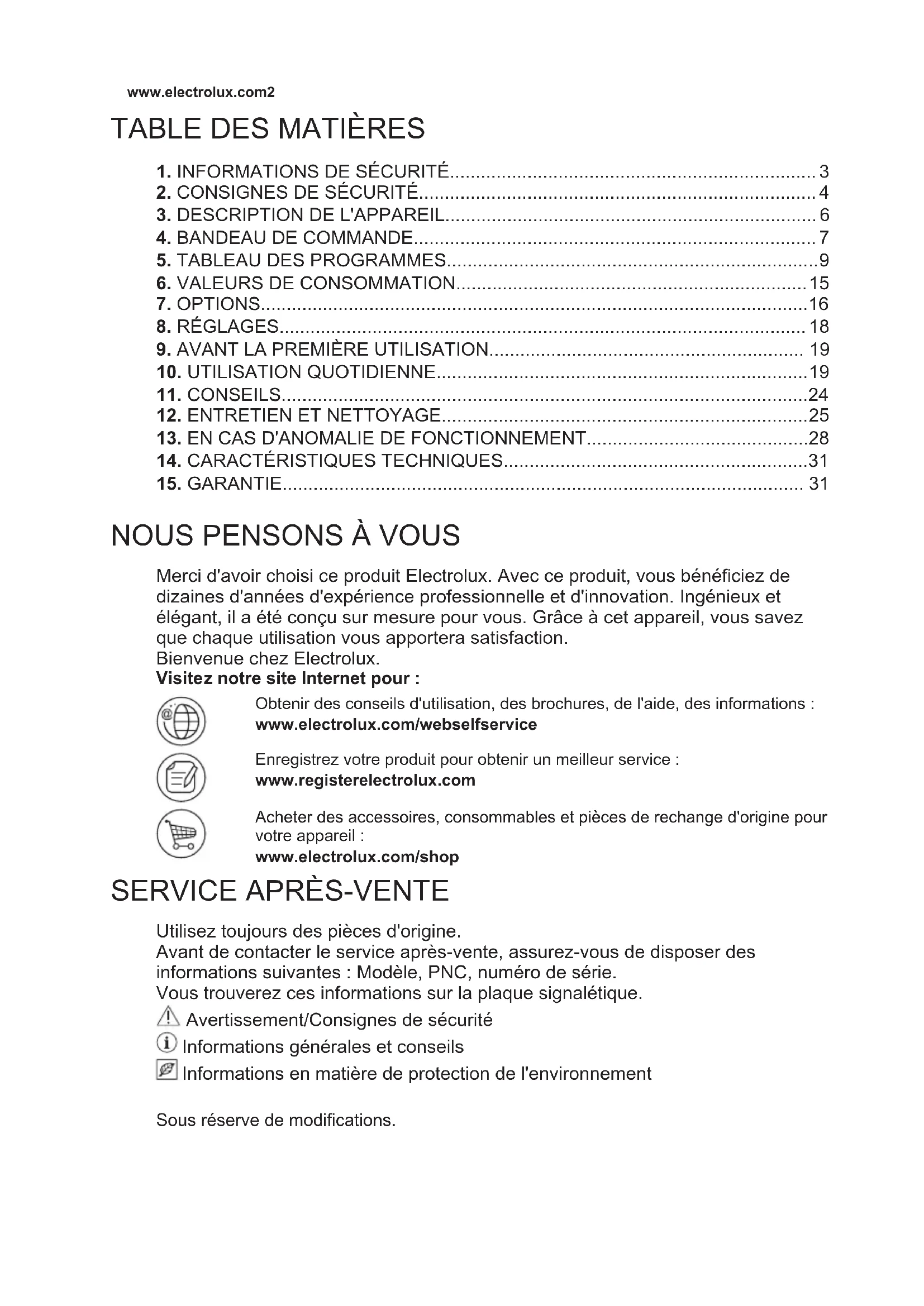 Merci d'avoir choisi ce produit Electrolux. Avec ce produit, vous bénéficiez de dizaines d'années d'expérience professionnelle et d'innovation. Ingénieux et élégant, il a été conçu sur mesure pour vous. Grâce à cet appareil, vous savez que chaque utilisation vous apportera satisfaction. Bienvenue chez Electrolux. Visitez notre site Internet pour : Obtenir des conseils d'utilisation, des brochures, de l'aide, des informations : www.electrolux.com/webselfservice Enregistrez votre produit pour obtenir un meilleur service : www.registerelectrolux.com Acheter des accessoires, consommables et pièces de rechange d'origine pour votre appareil : www.electrolux.com/shop
