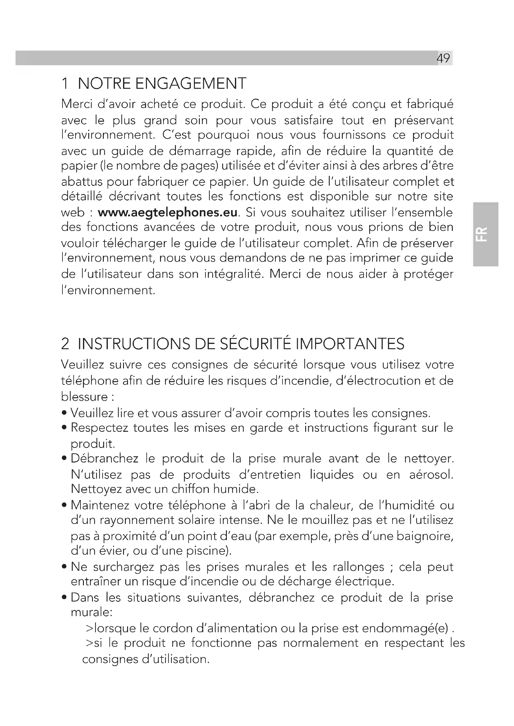 Ce produit est conforme aux prescriptions essentielles et aux autres dispositions pertinentes de la directive 1999/5/EC de la R&TTE. La déclaration de conformité est disponible à l’adresse suivante : www.aegtelephones.eu 17 MISE AU REBUT DE L‘APPAREIL (RESPECT DE L‘ENVIRONNEMENT) Lorsque l’appareil est hors d’usage, ne le jetez pas dans les ordures ménagères mais apportez-le à un point de collecte où ses composants électriques et électroniques pourront être recyclés. Ceci est indiqué par le symbole figurant sur le produit, dans le mode d’emploi ou sur l‘emballage. Certains matériaux de l’appareil sont réutilisables si vous l‘apportez à un centre de recyclage. En permettant la réutilisation de certaines pièces ou matières premières d’appareils hors d’usage, vous contribuez de façon importante à la protection de l‘environnement. Veuillez vous adresser aux autorités locales pour plus d‘informations concernant les points de collecte de votre région. Les piles doivent être retirées avant la mise au rebut de l‘appareil. Éliminez les piles en respectant l’environnement et la réglementation de votre pays.1 ONZE ZORG Wij willen u bedanken voor de aankoop van dit product. Bij de ontwikkeling en montage van dit product stonden u en het milieu centraal. Daarom krijgt u bij dit product een verkorte installatiehandleiding, zodat er minder papier wordt gebruikt en er dus minder bomen moeten worden gekapt. Een volledige, gedetailleerde gebruikershandleiding met beschrijvingen van alle functies vindt u op onze website www.aegtelephones.eu. Hier kunt u de gebruikershandleiding integraal downloaden zodat u alle geavanceerde functies van uw product kunt gebruiken. Met het oog op het milieu zouden wij u evenwel willen verzoeken om de volledige handleiding niet af te drukken. Bedankt dat u ons steunt in onze zorg voor het milieu. 2 BELANGRIJKE VEILIGEIDSINSTRUCTIES Volg deze veiligheidsvoorschriften wanneer u uw telefoonapparatuur gebruikt om het risico van brand, elektrische schokken of lichamelijk letsel te verminderen: