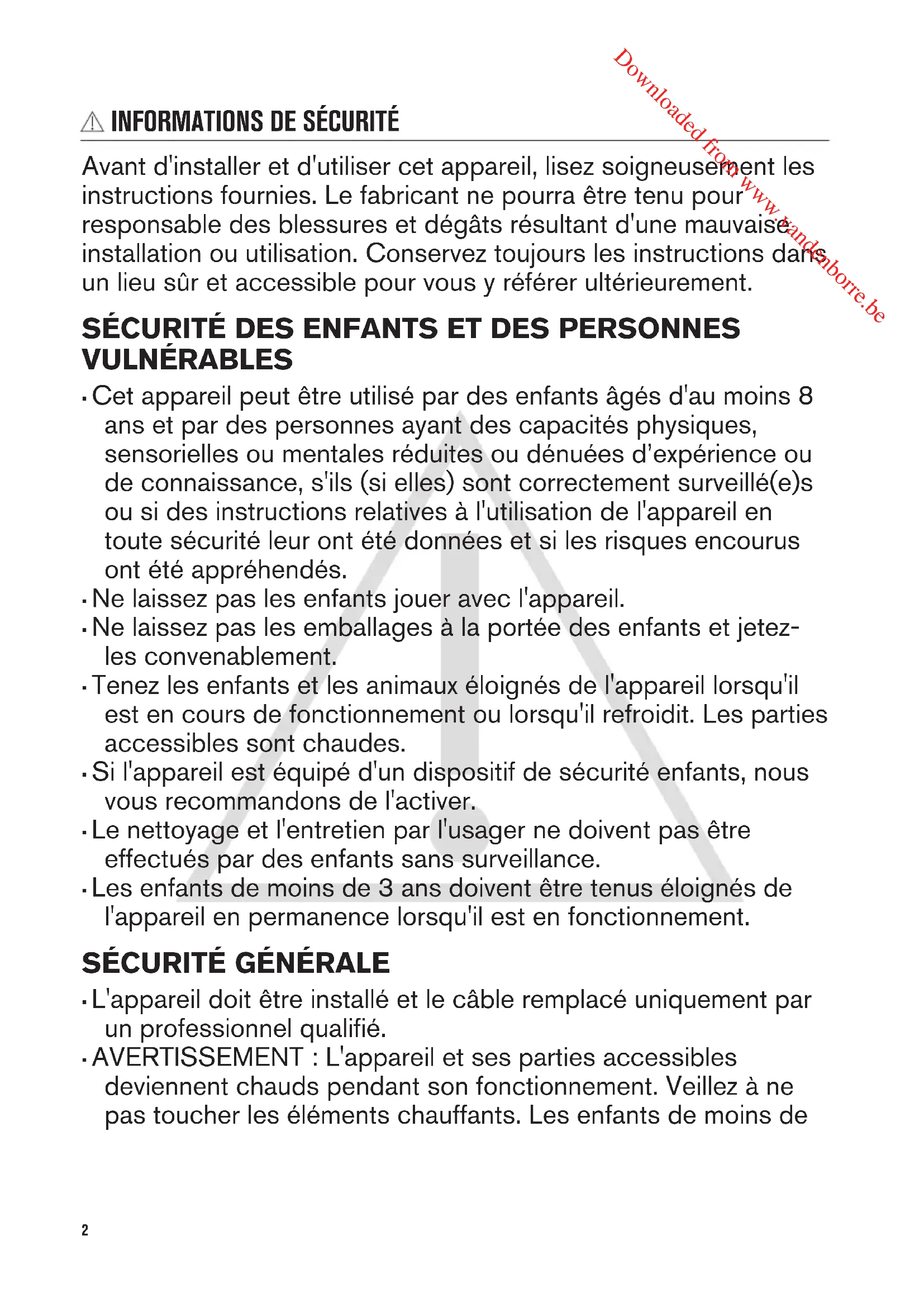 Downloaded from www.vandenborre.be• Ne laissez pas les câbles d'alimentation entrer en contact avec la porte de l'appareil, particulièrement lorsque la porte est chaude.