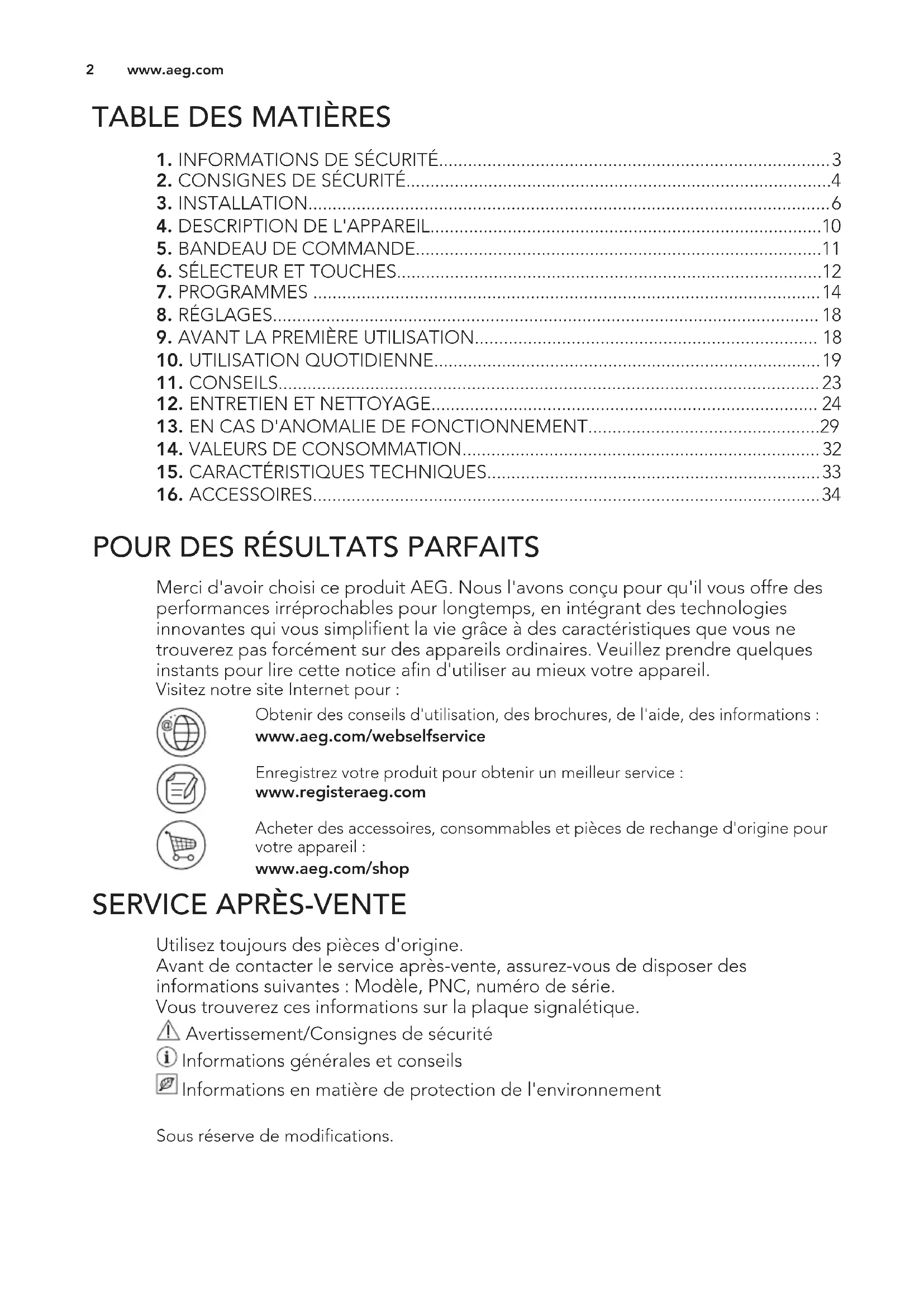 Merci d'avoir choisi ce produit AEG. Nous l'avons conçu pour qu'il vous offre des performances irréprochables pour longtemps, en intégrant des technologies innovantes qui vous simplifient la vie grâce à des caractéristiques que vous ne trouverez pas forcément sur des appareils ordinaires. Veuillez prendre quelques instants pour lire cette notice afin d'utiliser au mieux votre appareil. Visitez notre site Internet pour : Obtenir des conseils d'utilisation, des brochures, de l'aide, des informations : www.aeg.com/webselfservice Enregistrez votre produit pour obtenir un meilleur service : www.registeraeg.com Acheter des accessoires, consommables et pièces de rechange d'origine pour votre appareil : www.aeg.com/shop