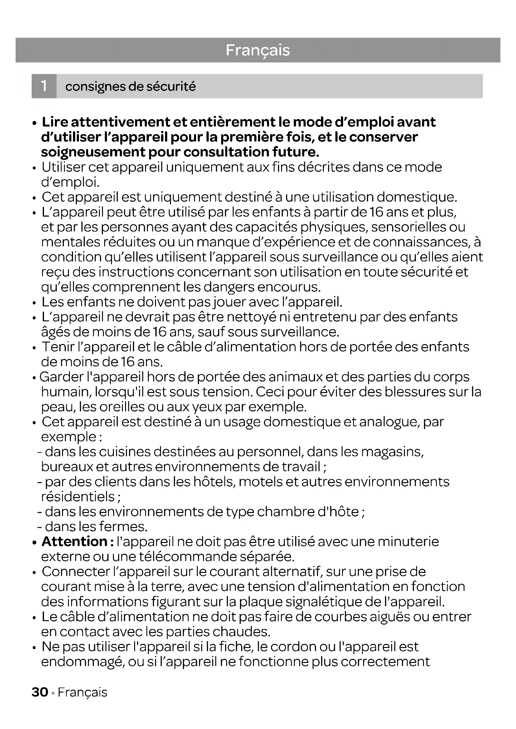 - consignes de sécurité page 30
