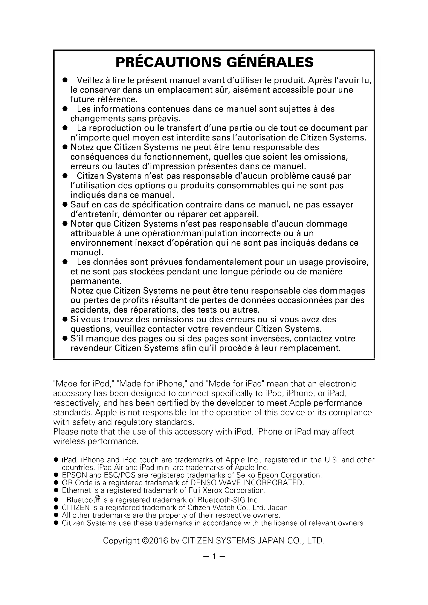 Veillez à lire le présent manuel avant d’utiliser le produit. Après l’avoir lu, le conserver dans un emplacement sûr, aisément accessible pour une future référence. Les informations contenues dans ce manuel sont sujettes à des changements sans préavis. La reproduction ou le transfert d’une partie ou de tout ce document par n’importe quel moyen est interdite sans l’autorisation de Citizen Systems. Notez que Citizen Systems ne peut être tenu responsable des conséquences du fonctionnement, quelles que soient les omissions, erreurs ou fautes d’impression présentes dans ce manuel. Citizen Systems n’est pas responsable d’aucun problème causé par l’utilisation des options ou produits consommables qui ne sont pas indiqués dans ce manuel. Sauf en cas de spécification contraire dans ce manuel, ne pas essayer d’entretenir, démonter ou réparer cet appareil. Noter que Citizen Systems n’est pas responsable d’aucun dommage attribuable à une opération/manipulation incorrecte ou à un environnement inexact d’opération qui ne sont pas indiqués dedans ce manuel. Les données sont prévues fondamentalement pour un usage provisoire, et ne sont pas stockées pendant une longue période ou de manière permanente. Notez que Citizen Systems ne peut être tenu responsable des dommages ou pertes de profits résultant de pertes de données occasionnées par des accidents, des réparations, des tests ou autres. Si vous trouvez des omissions ou des erreurs ou si vous avez des questions, veuillez contacter votre revendeur Citizen Systems. S’il manque des pages ou si des pages sont inversées, contactez votre revendeur Citizen Systems afin qu’il procède à leur remplacement. "Made for iPod," "Made for iPhone," and "Made for iPad" mean that an electronic accessory has been designed to connect specifically to iPod, iPhone, or iPad, respectively, and has been certified by the developer to meet Apple performance standards. Apple is not responsible for the operation of this device or its compliance with safety and regulatory standards. Please note that the use of this accessory with iPod, iPhone or iPad may affect wireless performance. iPad, iPhone and iPod touch are trademarks of Apple Inc., registered in the U.S. and other countries. iPad Air and iPad mini are trademarks of Apple Inc. EPSON and ESC/POS are registered trademarks of Seiko Epson Corporation. QR Code is a registered trademark of DENSO WAVE INCORPORATED. Ethernet is a registered trademark of Fuji Xerox Corporation. Bluetooth